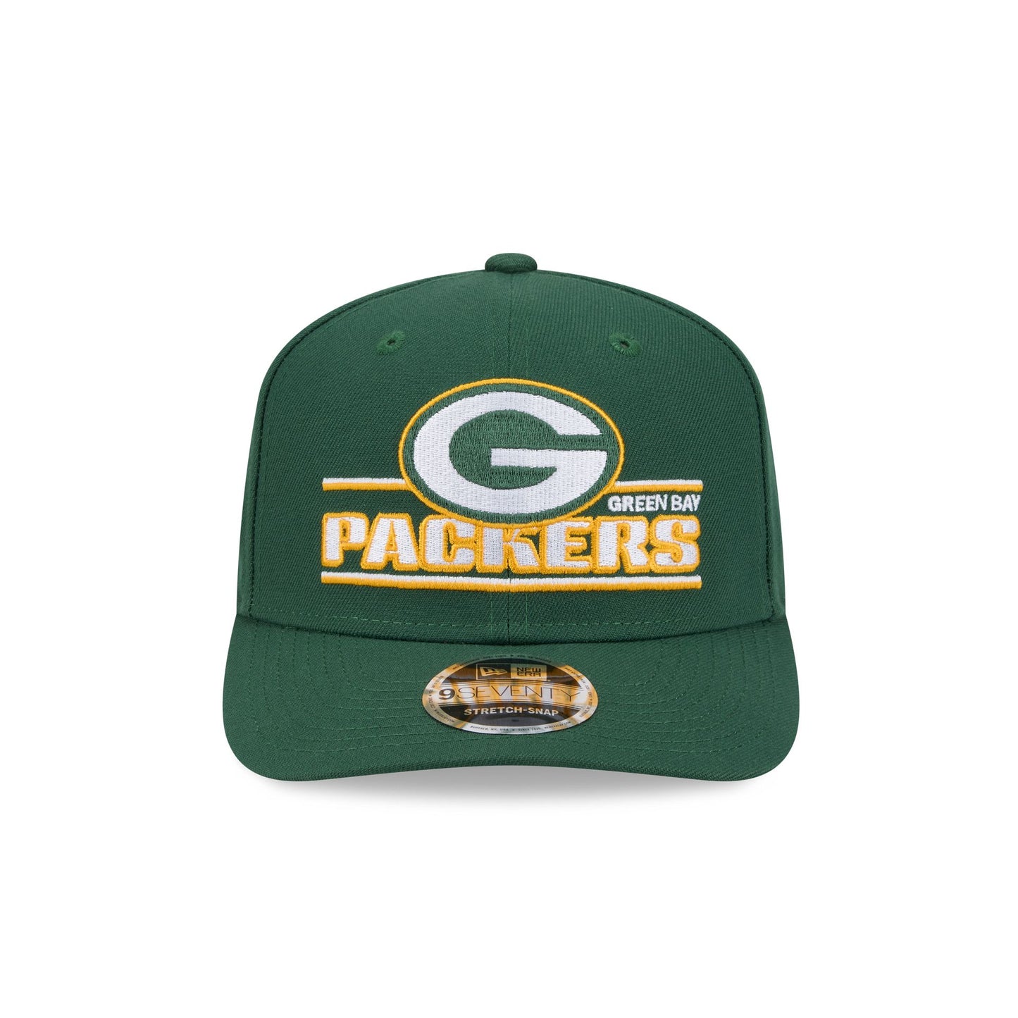 The Green Bay Packers Stated 9SEVENTY Stretch-Snap features an embroidered Packers graphic a the front panels with an adjustable stretch-snap closure at the rear and a gray undervisor.