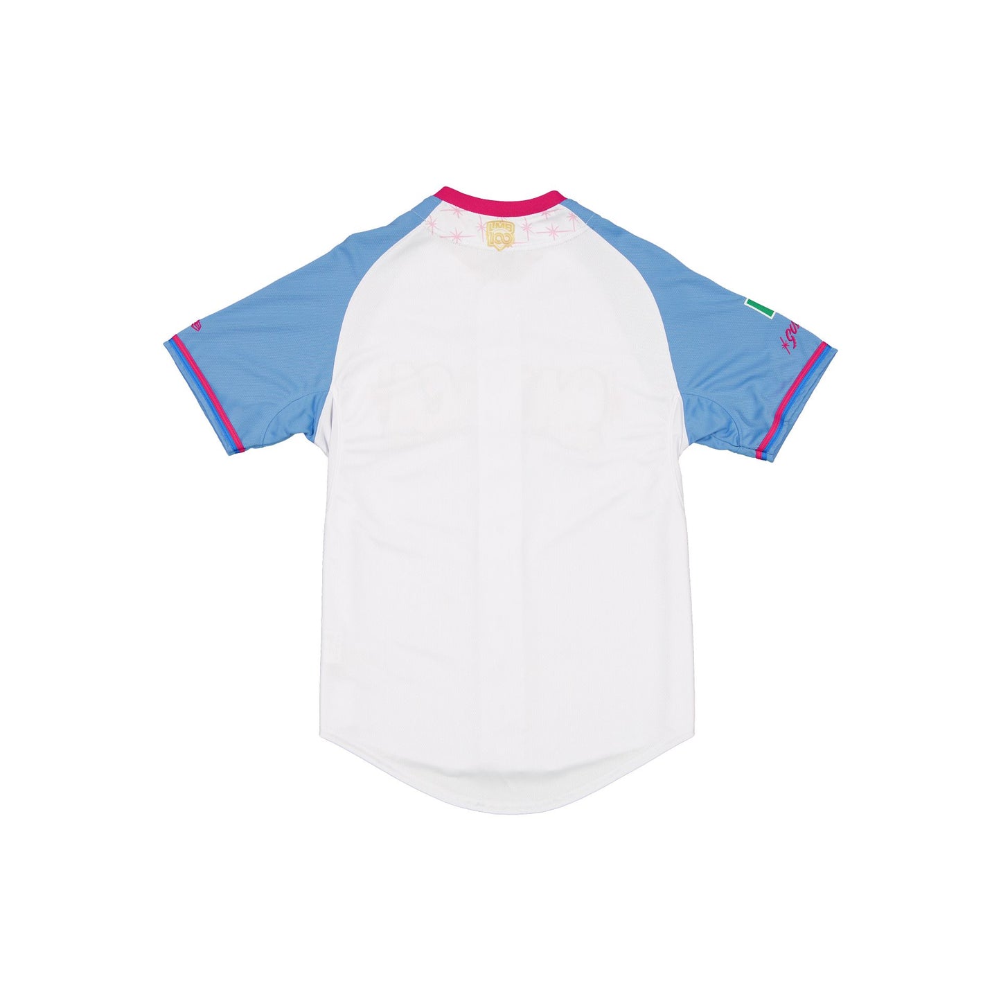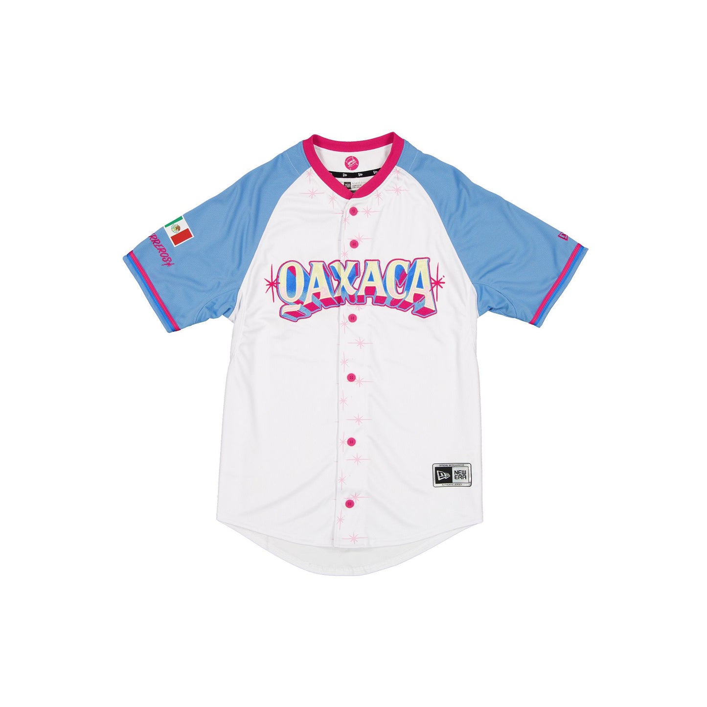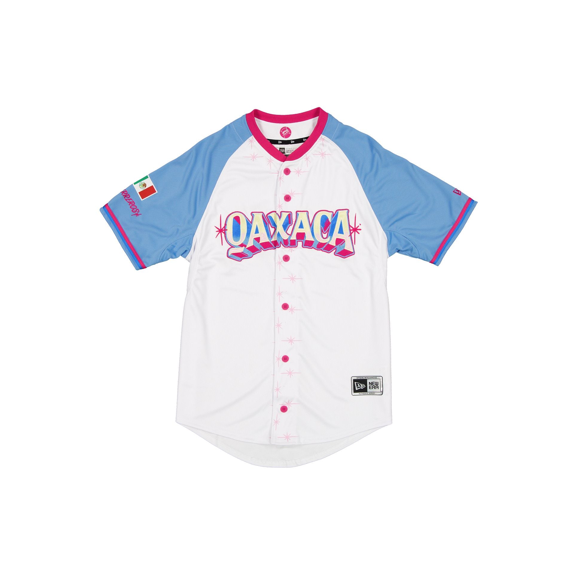 The Guerreros de Oaxaca LMB 100th Anniversary Alt Jersey features an embroidered Guerreros wordmark at the chest with a New Era Official Merchandise patch at the front hemline, a team logo at the right sleeve, and a LMB 100th Anniversary logo at the rear.