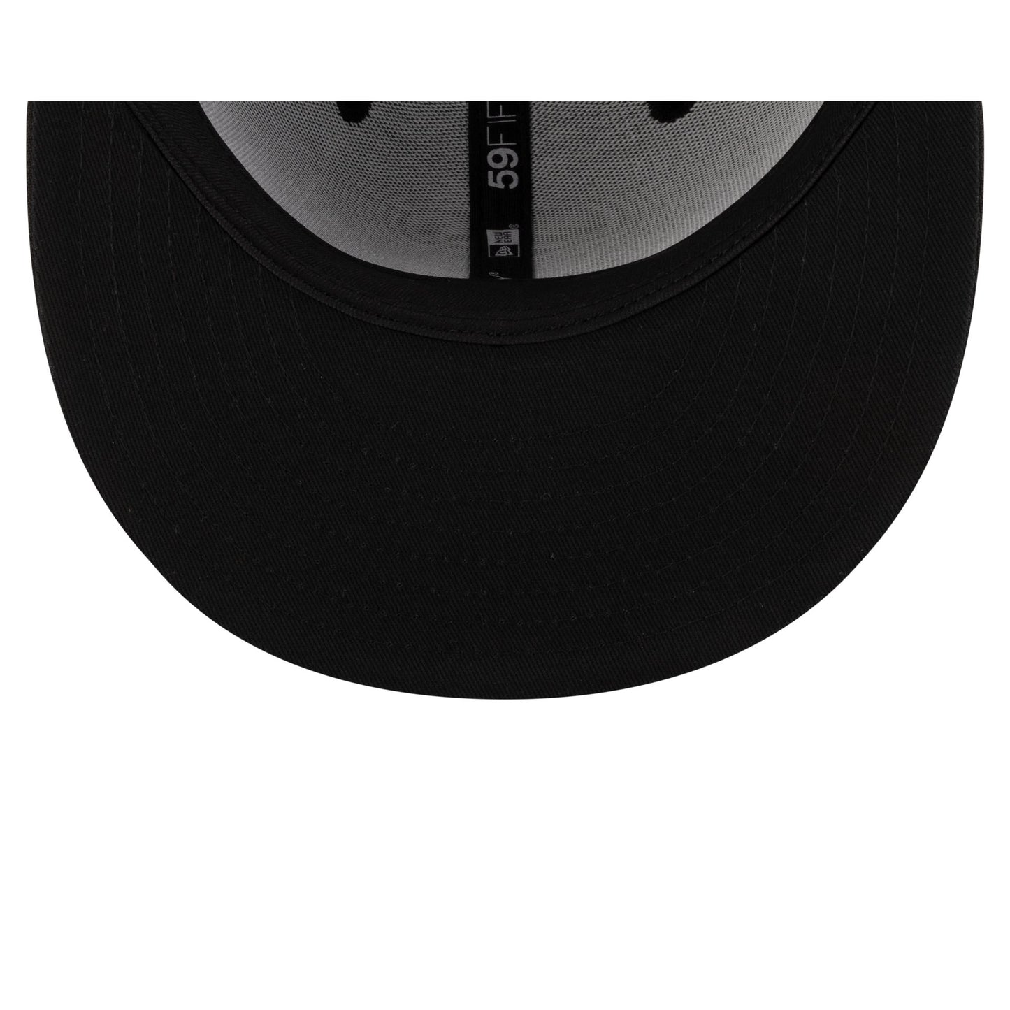 The Guerreros de Oaxaca LMB 100th Anniversary Home 59FIFTY Fitted Cap features an embroidered Guerreros logo at the front panels with a LMB 100th Anniversary patch at the rear, the flag of Mexico at the right-wear side, and black undervisor.