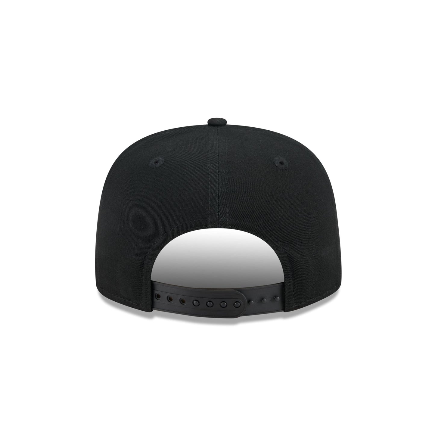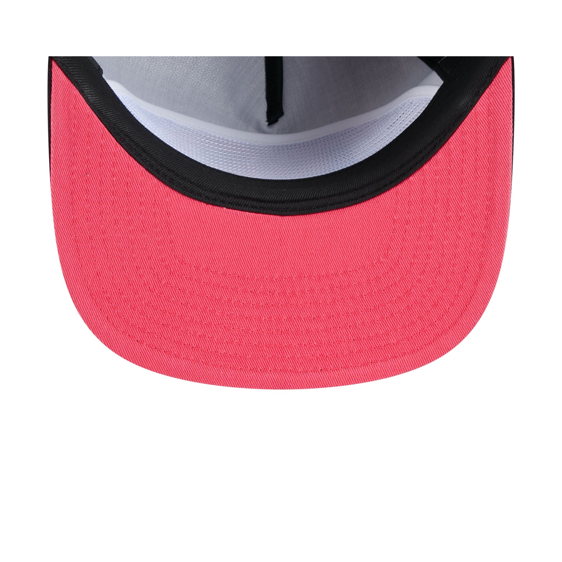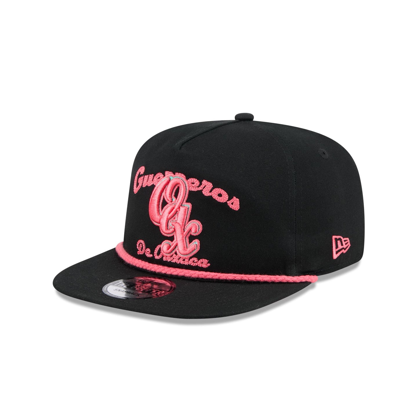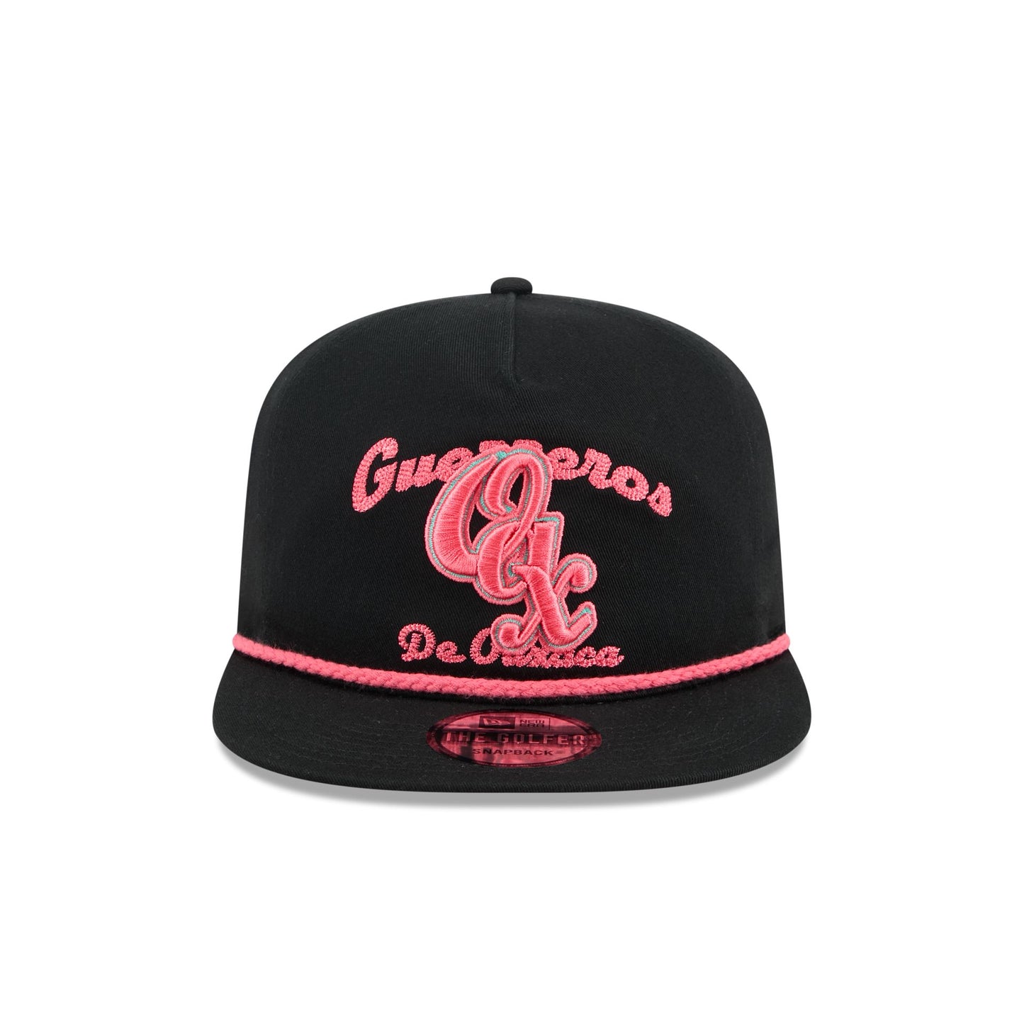 The Guerreros de Oaxaca Two-Tone Black Golfer features a pink embroidered Guerreros wordmark with a layered logo on top at the front panel with a pink undervisor and a snapback closure at the rear.