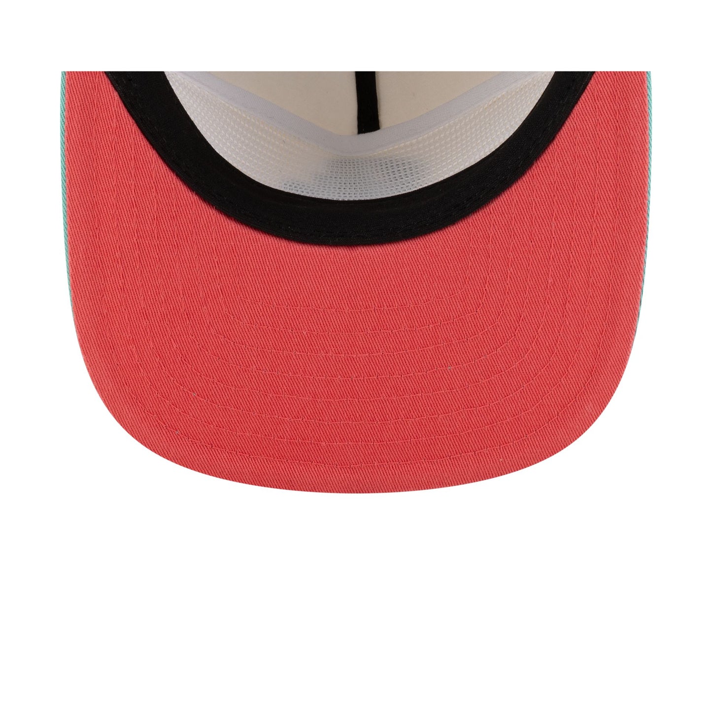 The Guerreros de Oaxaca Two-Tone Golfer features a mint embroidered Guerreros logo at the front panel with a team patch at the right-wear side, a coral undervisor, and a snapback closure at the rear.