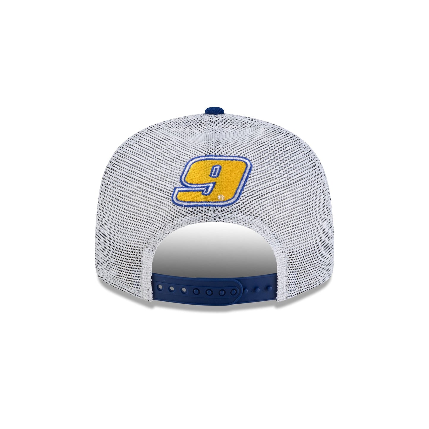 The Hendrick Motorsports Chase Elliott NAPA Racing 9FIFTY Trucker features an embroidered Hendrick Motorsports logo at the front panels with the driver's number above an adjustable snapback closure at the rear and a green undervisor.