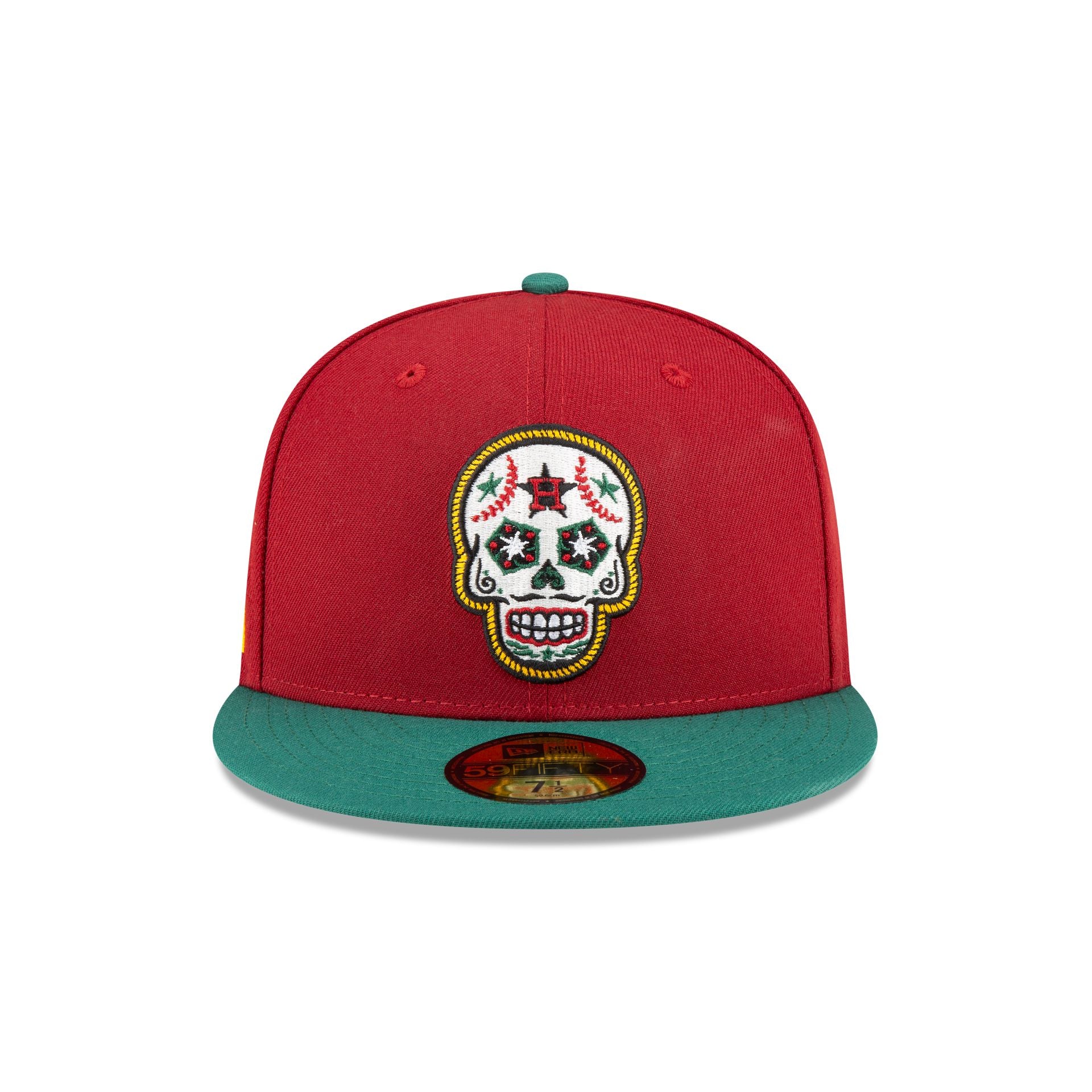 The Houston Astros Cinco de Mayo 59FIFTY Fitted Cap features an embroidered Astros inspired sugar skull at the front panels with a matching MLB Batterman logo at the rear, a Mexico flag at the right-wear side, and a gray undervisor.