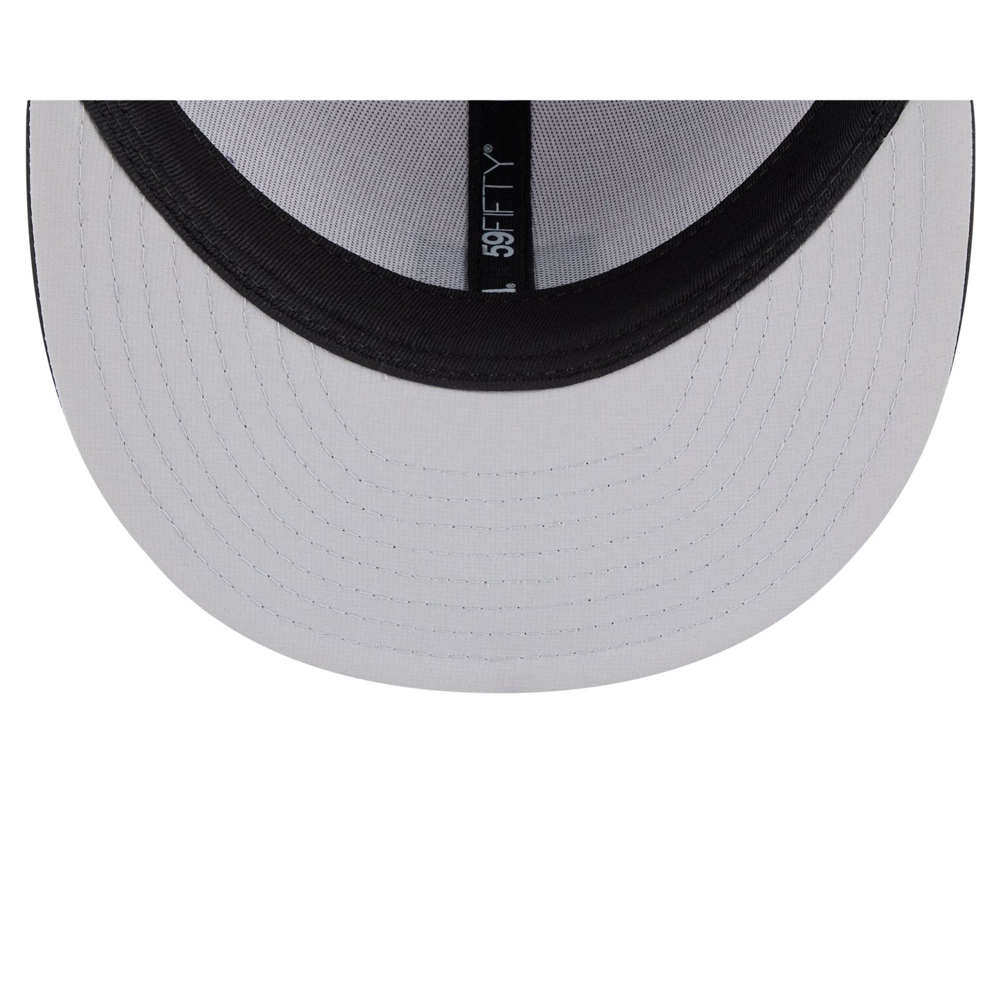 The Houston Astros 2026 Clubhouse Black & White 59FIFTY Fitted Cap features a sewn-down silicone Astros logo patch at the front panels with a water-repellent quill tech fabrication throughout. Additional details include a silicone MLB Batterman logo patch at the rear and a gray undervisor. The visor is accented with a silicone transfer team patch.