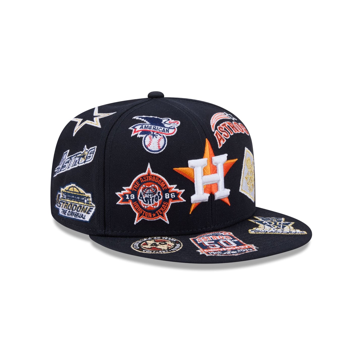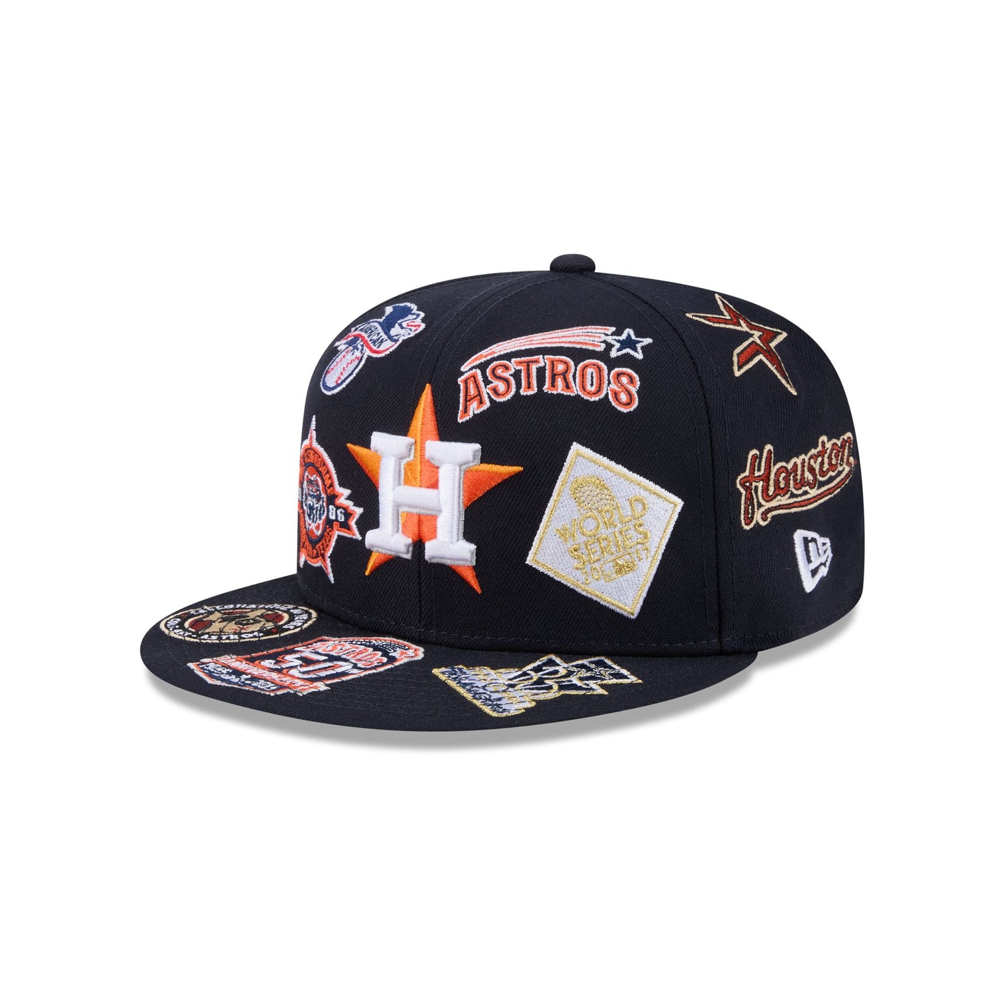 The Houston Astros All Over 59FIFTY Fitted Cap features embroidered Astros team patches throughout the cap with the logo at the front panels, the MLB Batterman logo at the rear, and a gray undervisor.