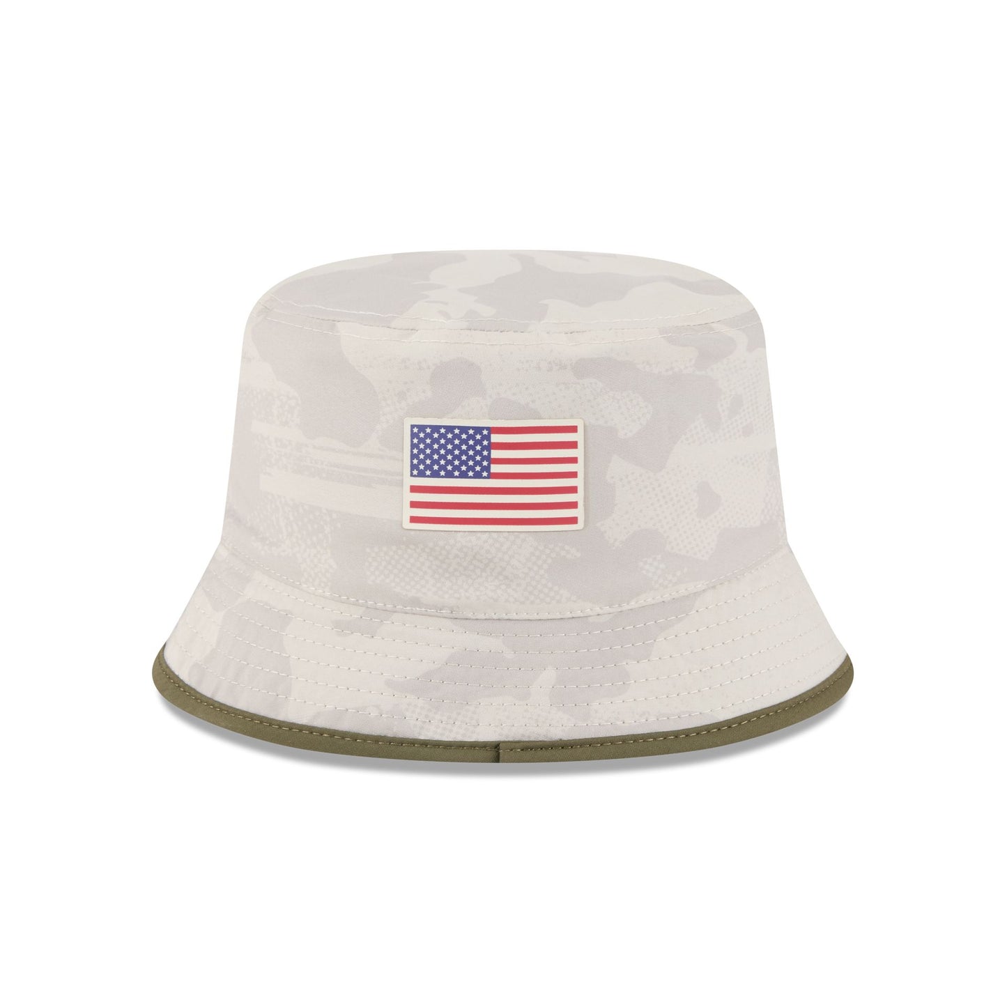 The Houston Astros Armed Forces Day 2025 Bucket Hat features an embroidered Astros logo at the front with the American Flag at the rear. This bucket hat is reversible.
