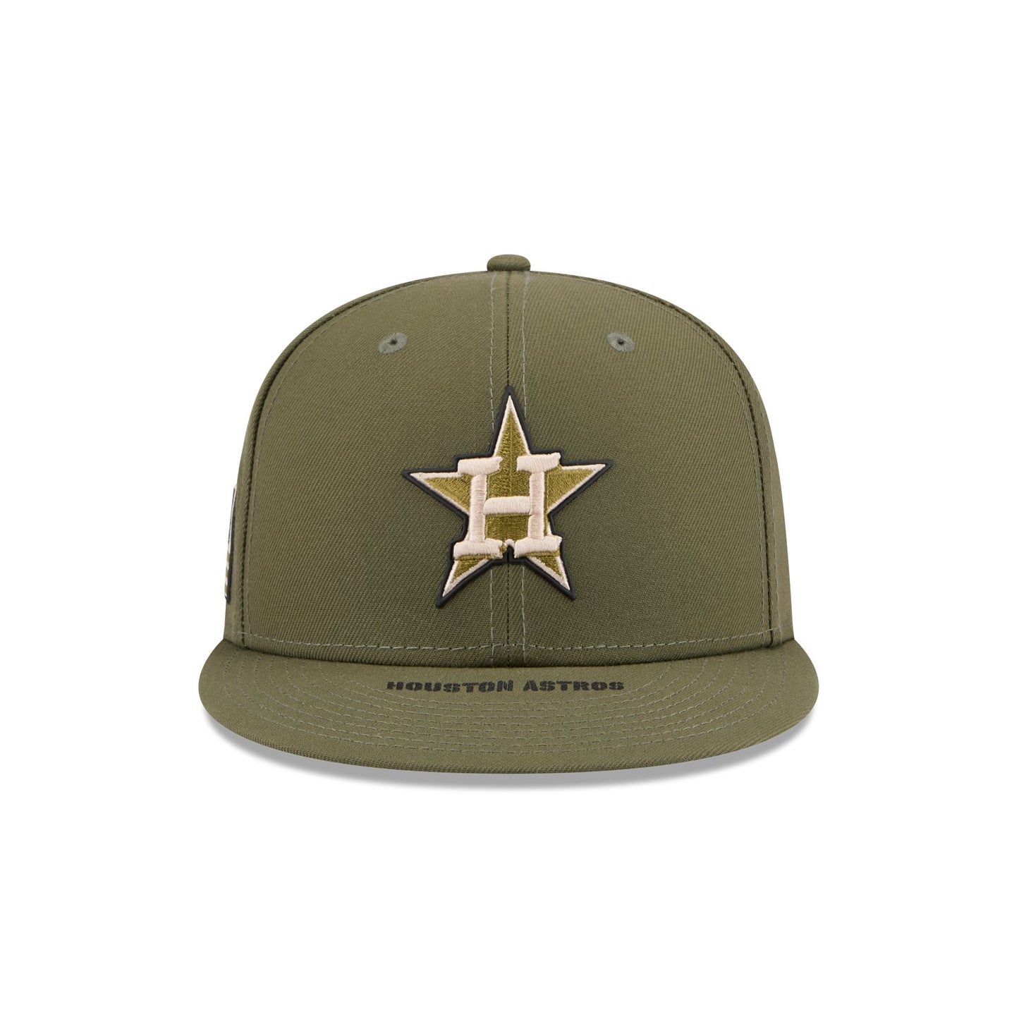 The Houston Astros Armed Forces Day 2026 9FIFTY Snapback features an embroidered Astros patch at the front panels with a matching MLB Batterman logo above a snapback closure at the rear and a screen-printed team wordmark at the visor. Additional details include a heat sealed silicone USA flag patch at the right-wear side with screen-printed stars at a black undervisor, camo patterned interior panels, and an Armed Forces Day wordmark at the interior tape.