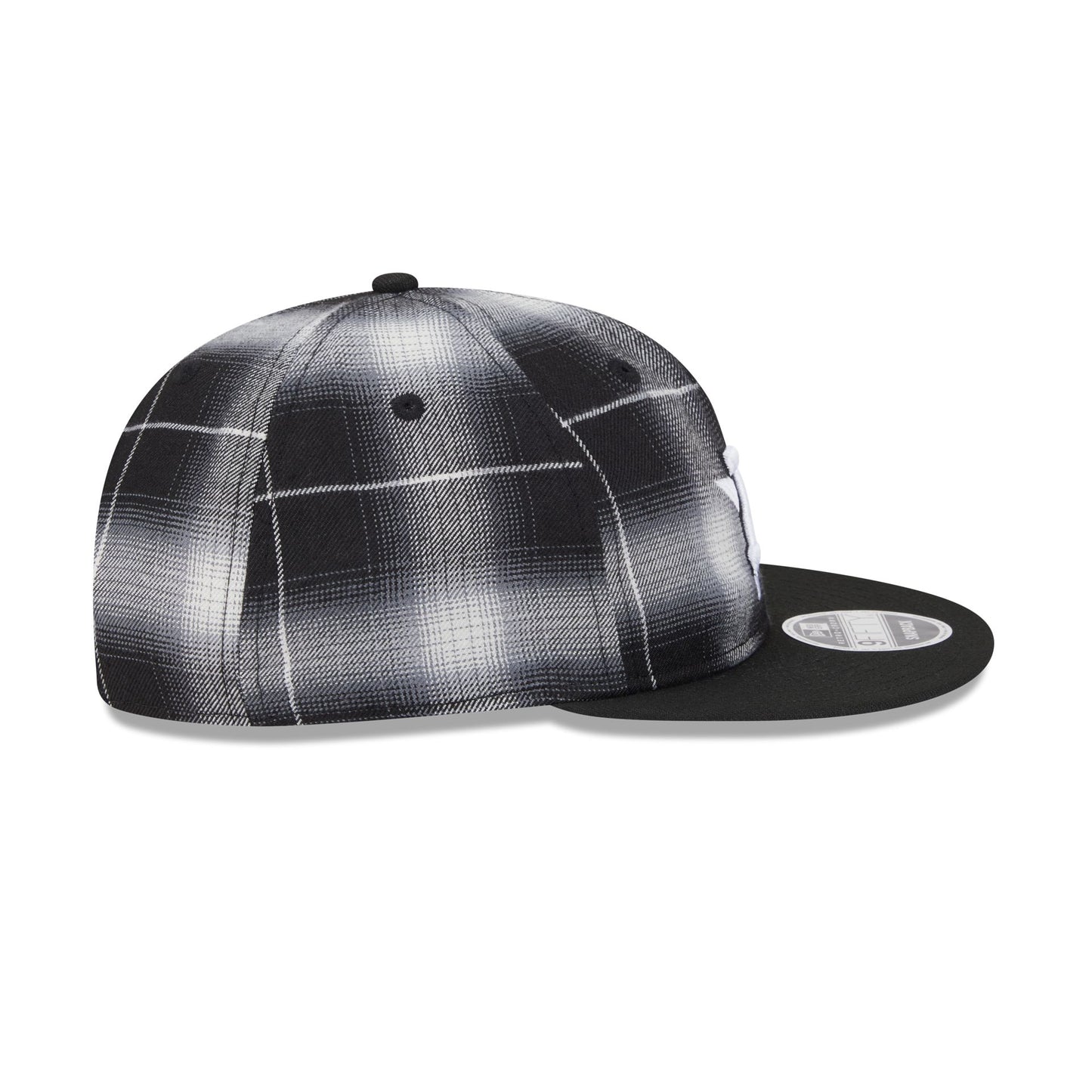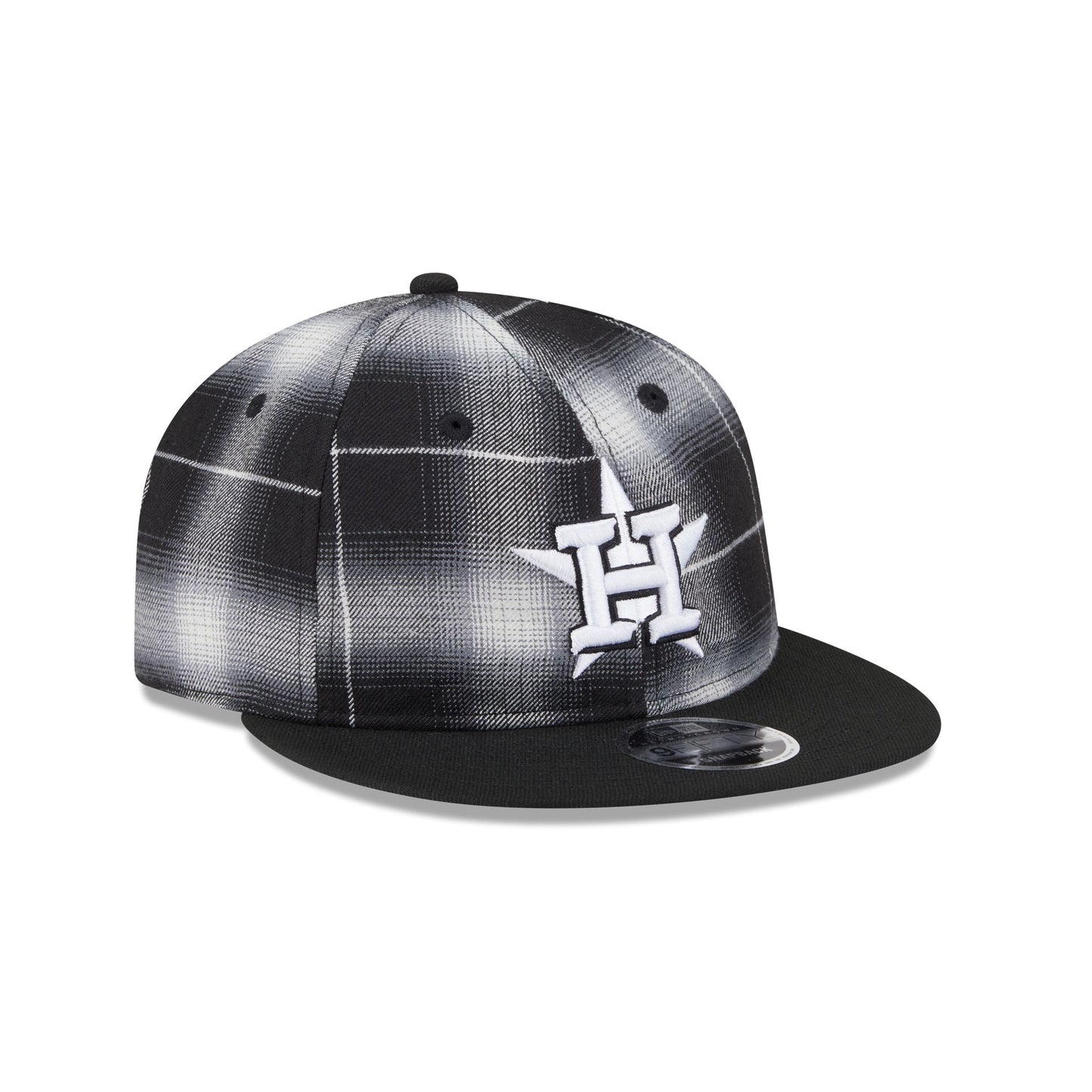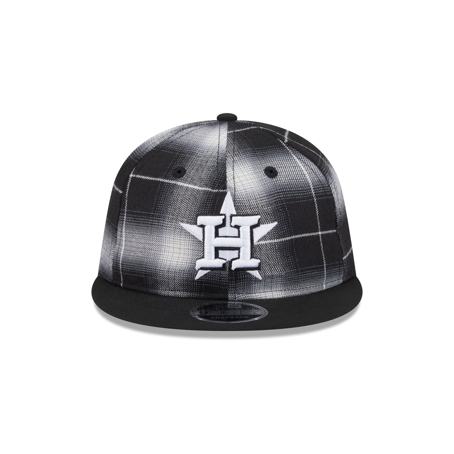 The Houston Astros Black and White Plaid Retro Crown 9FIFTY Snapback features an embroidered Astros logo at the front panels with a black visor, a gray undervisor, and a snapback closure at the rear.