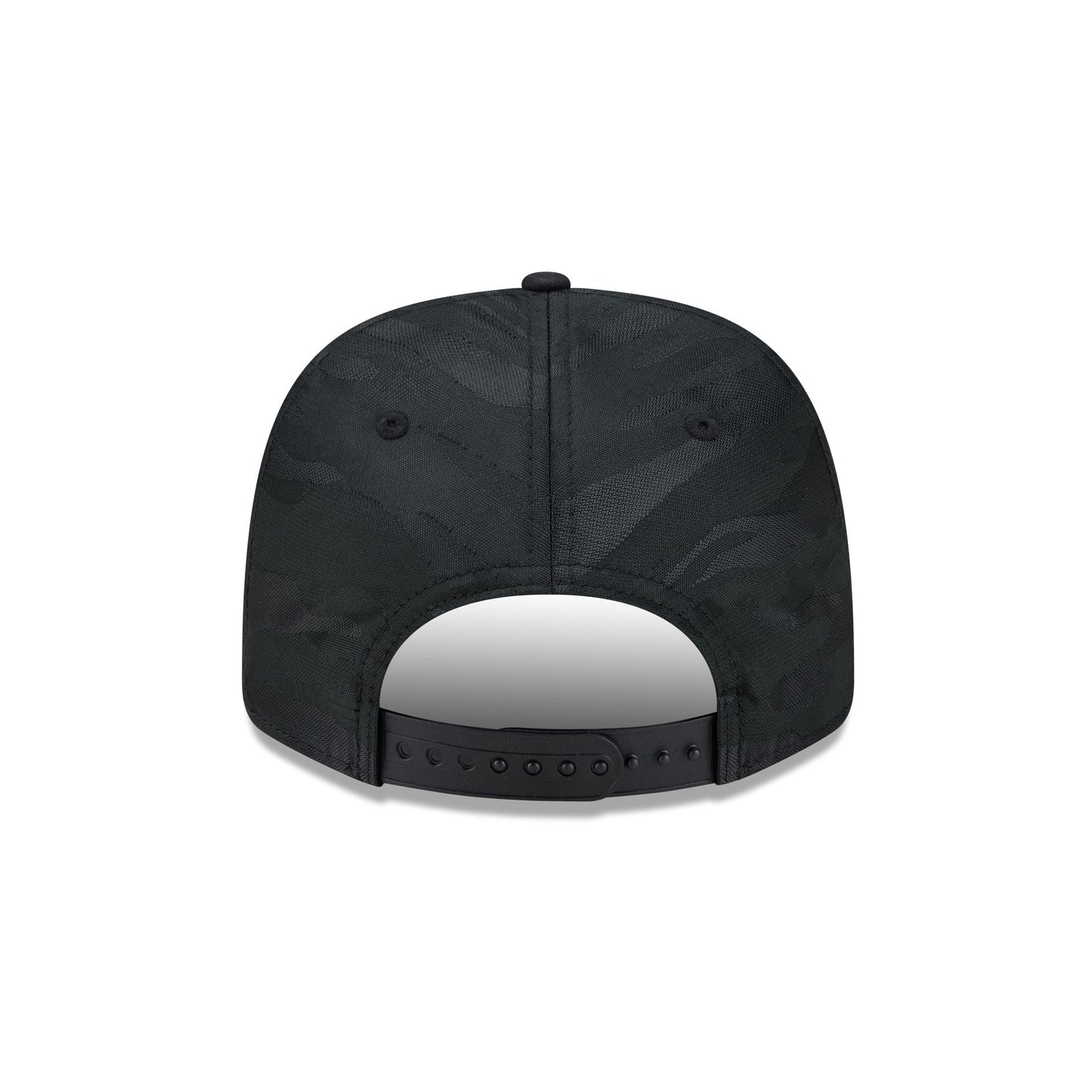 The Houston Astros Black Camo Split Panel 9SEVENTY Stretch-Snap features an embroidered Astros white wordmark at the front panel with a split crown construction and a team logo at the right-wear side. Additional details include a black camo print throughout, an adjustable stretch-snap closure at the rear, and a gray undervisor.