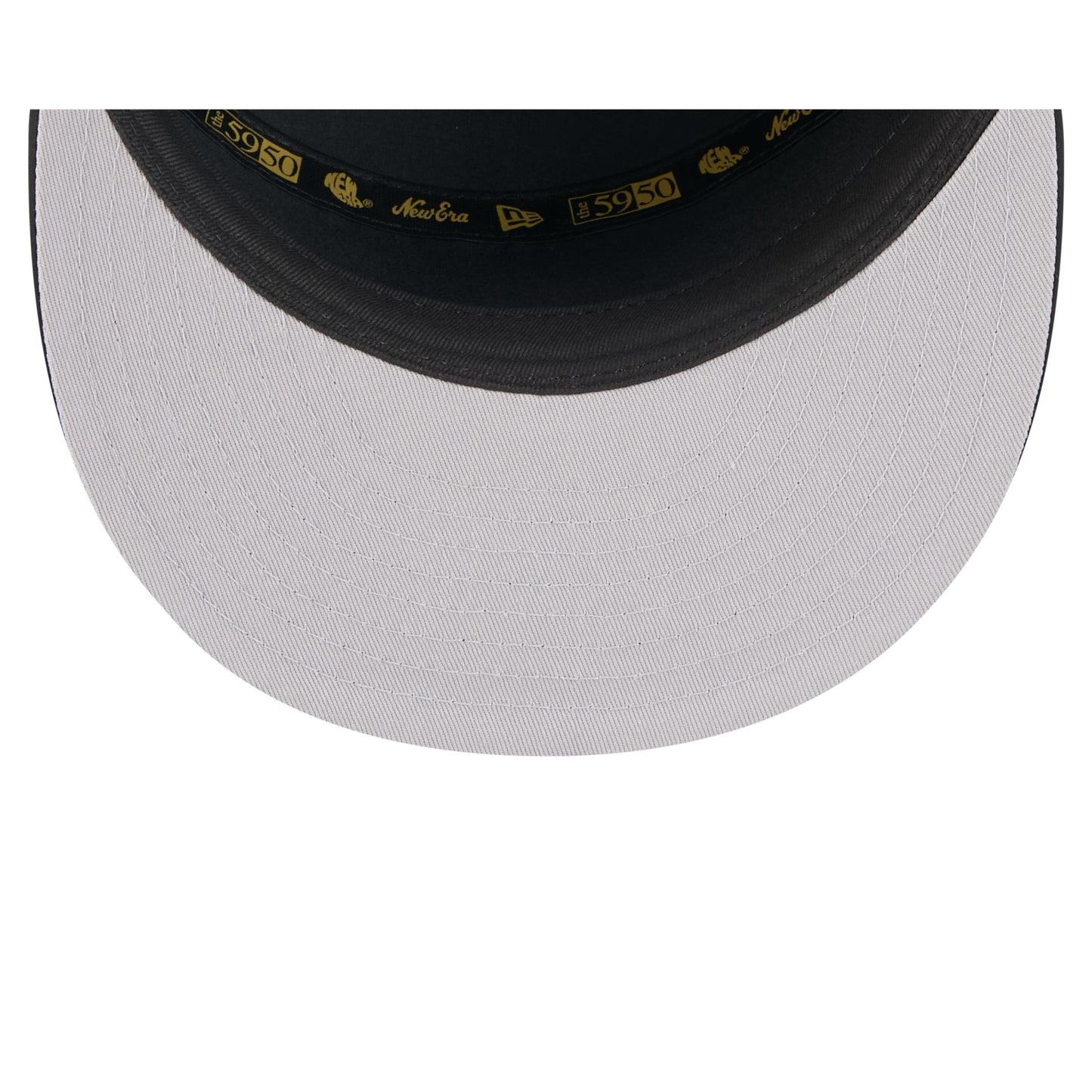 The Houston Astros Black Poly Rope 59FIFTY Split Panel Fitted Cap features a woven Astros logo at the front panels with a matching MLB Batterman embroidered at the rear. Additional details include a rope at the visor and a gray undervisor.