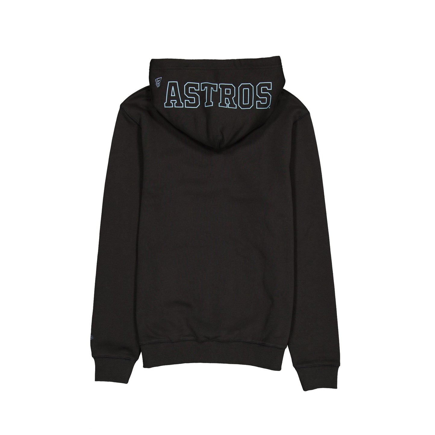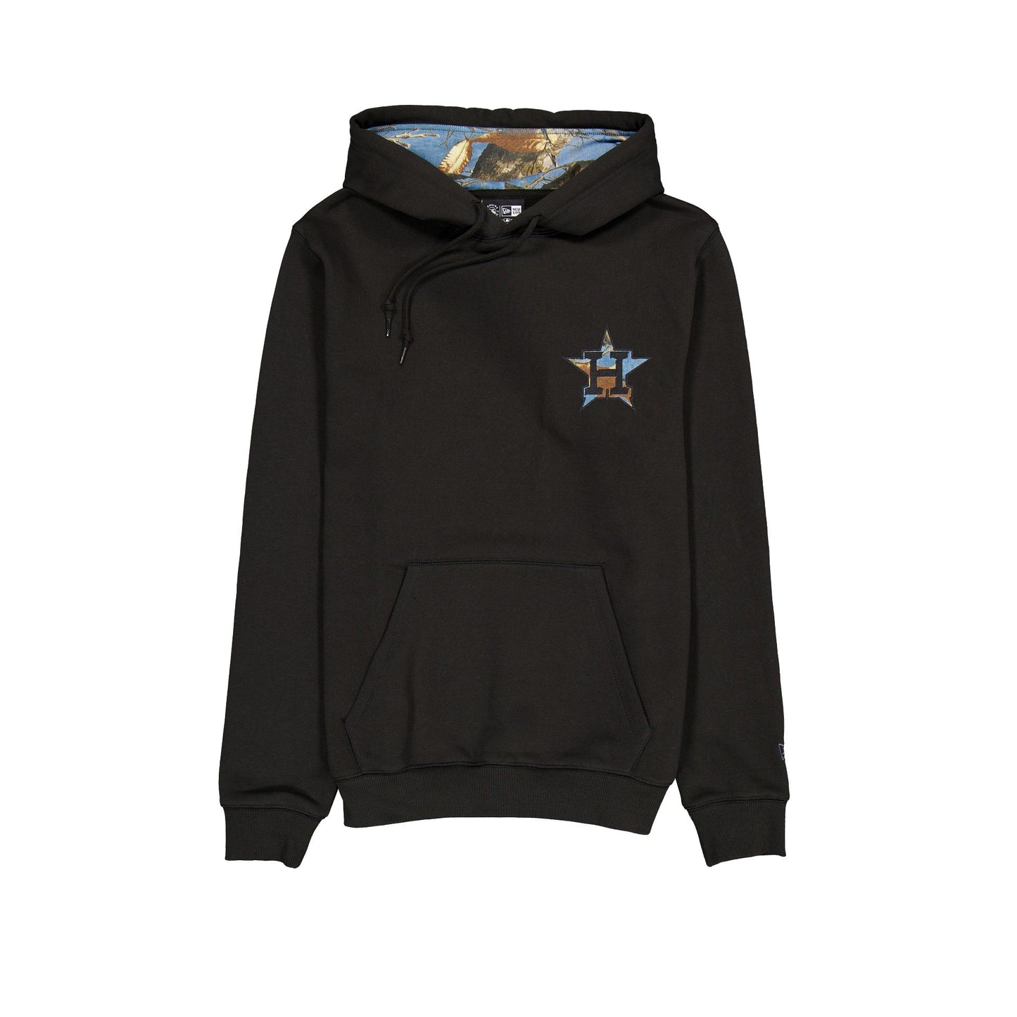 The Houston Astros Black Realtree Hoodie features an embroidered Astros reflective ink Realtree applique with kangaroo pockets, blue Realtree lining, and a team wordmark at the hood.