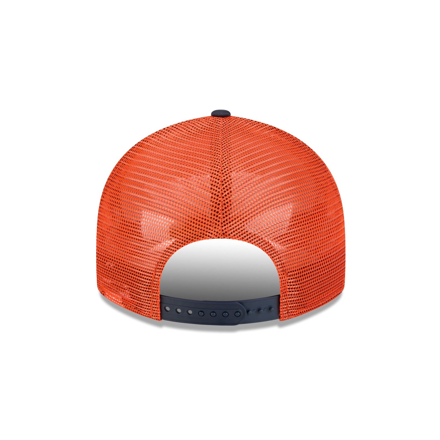 The Houston Astros Blocked Split Panel 9FIFTY Trucker features an embroidered Astros logo at the front panel with a split-crown construction. Additional details include an adjustable snapback closure at a mesh rear and a gray undervisor.
