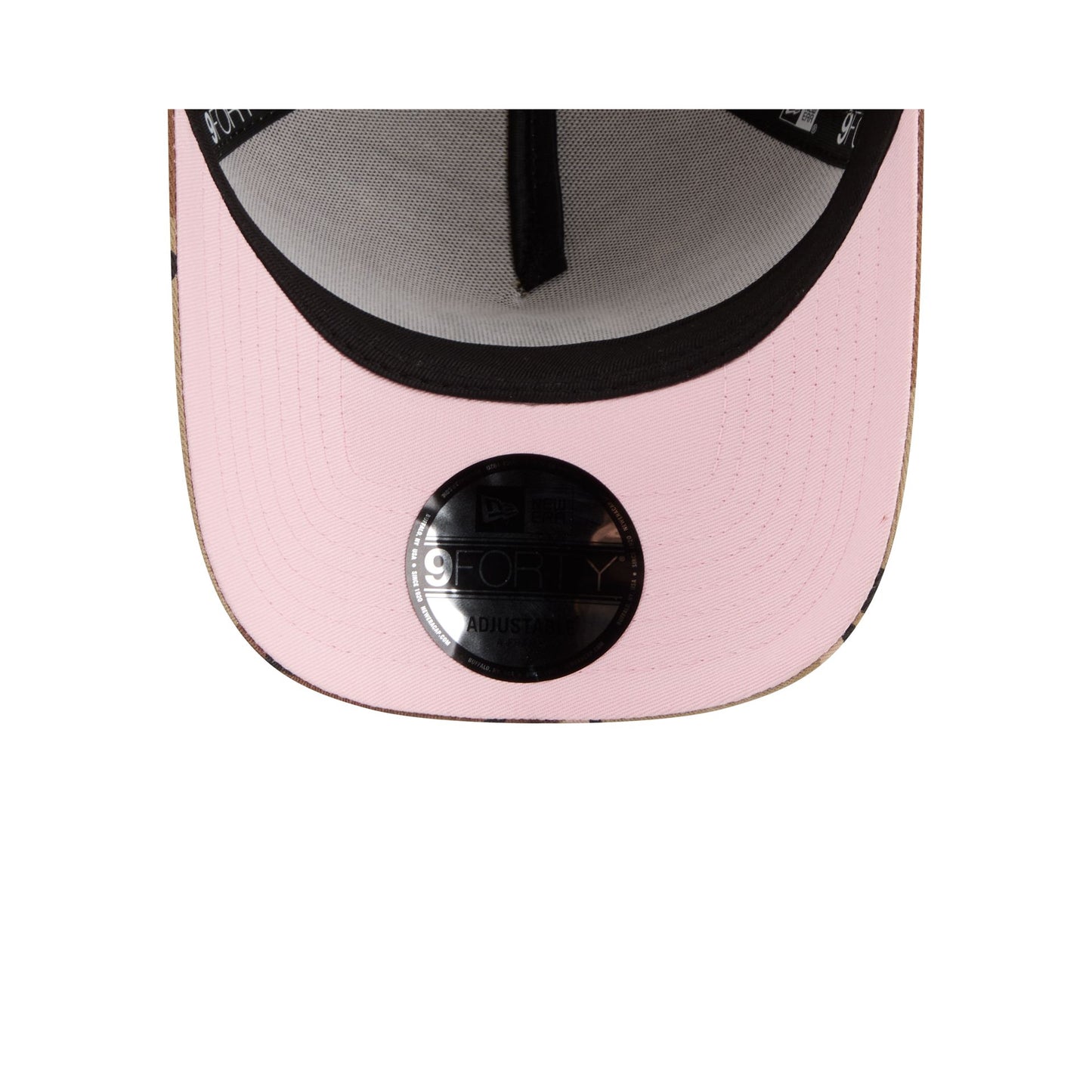 The Houston Astros Camo Hearts 9FORTY A-Frame Snapback features an embroidered Astros logo at the front panels against a camo and heart print pattern throughout. Additional details include an adjustable snapback closure at the rear and a pink undervisor.