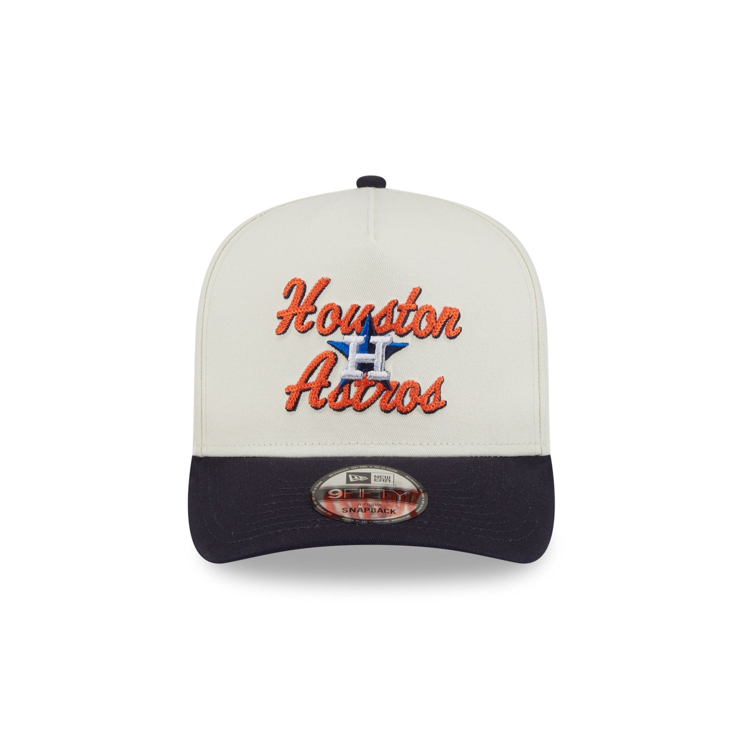 The Houston Astros Chainstitch 9FIFTY A-Frame Snapback features a chainstitch Astros logo and script wordmark at the front panels with a snapback closure at the rear and a gray undervisor.