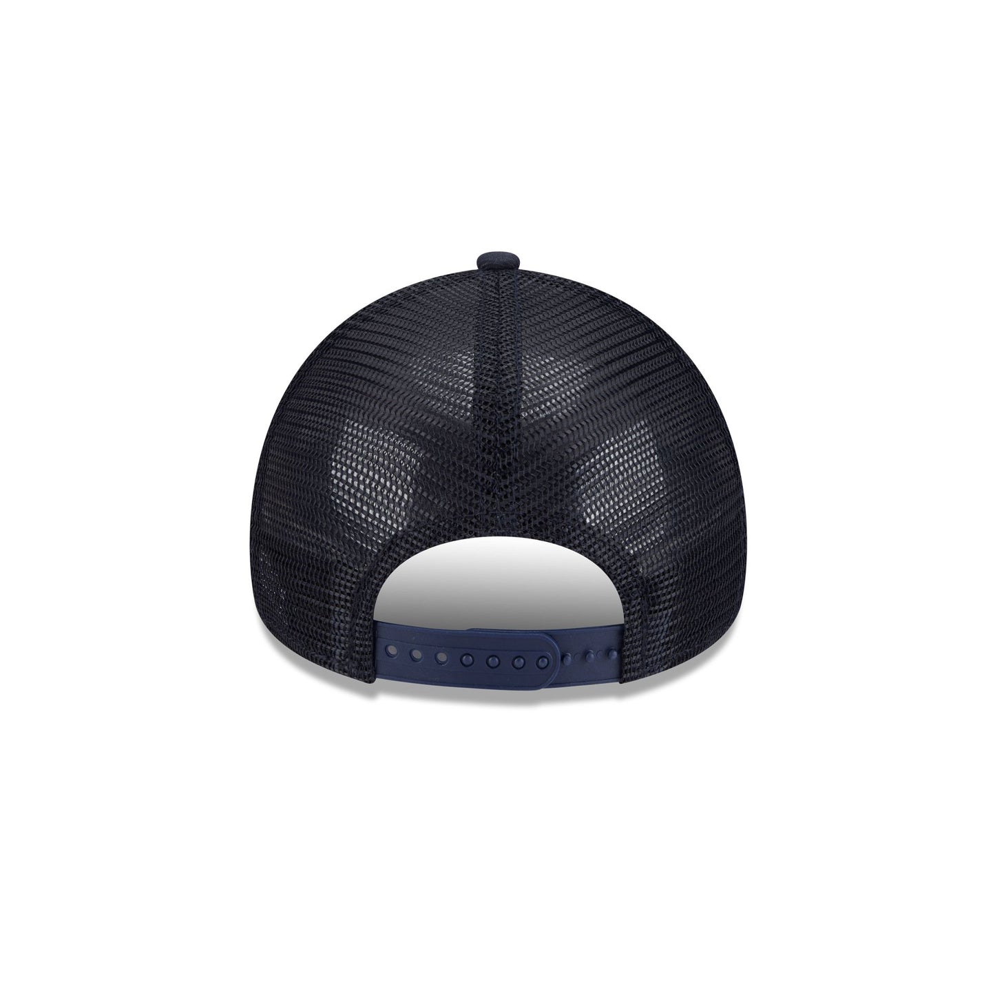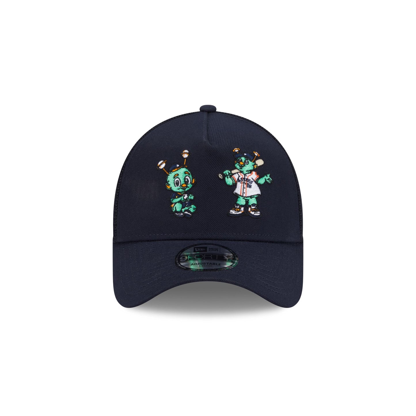 The Houston Astros Generation Mascots 9FORTY A-Frame Trucker features an embroidered Astros baby and adult mascot at the front panels. Additional details include a snapback closure at a mesh rear.