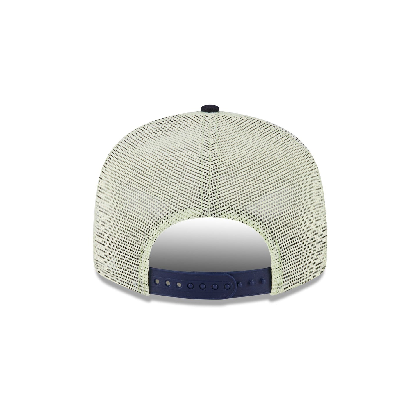 The Houston Astros Glow-In-The-Dark 9FIFTY Trucker features an embroidered Astros glow-in-the-dark logo and wordmark at the front panels. Additional details include a snapback closure at a glow-in-the-dark mesh rear and a gray undervisor.