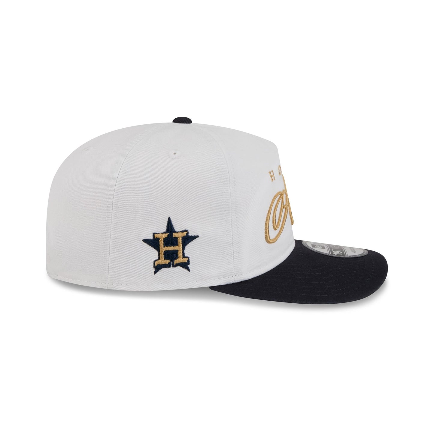 The Houston Astros Gold Scripted 19TWENTY Adjustable Cap features an embroidered Astros gold script wordmark at the front panels with a matching team logo at the right-wear side. Additional details include an adjustable snapback closure at the rear and a gray undervisor.