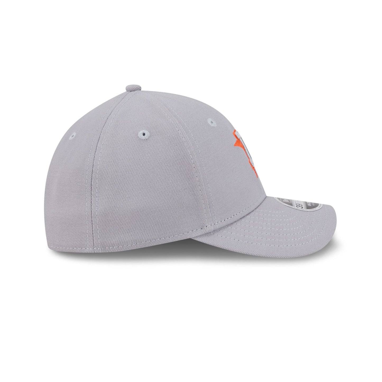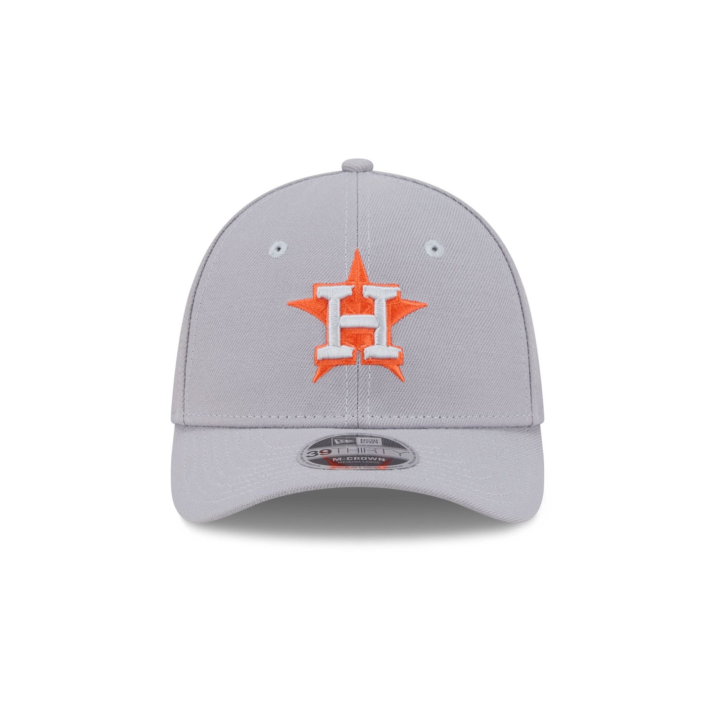 The Houston Astros Gray 39THIRTY M-Crown Stretch Fit Cap features an embroidered Astros logo at the front panels with a matching team wordmark at the rear and a gray undervisor. Additional details include a Performance Stretch sweatband and a New Era Flag at the left-wear side.