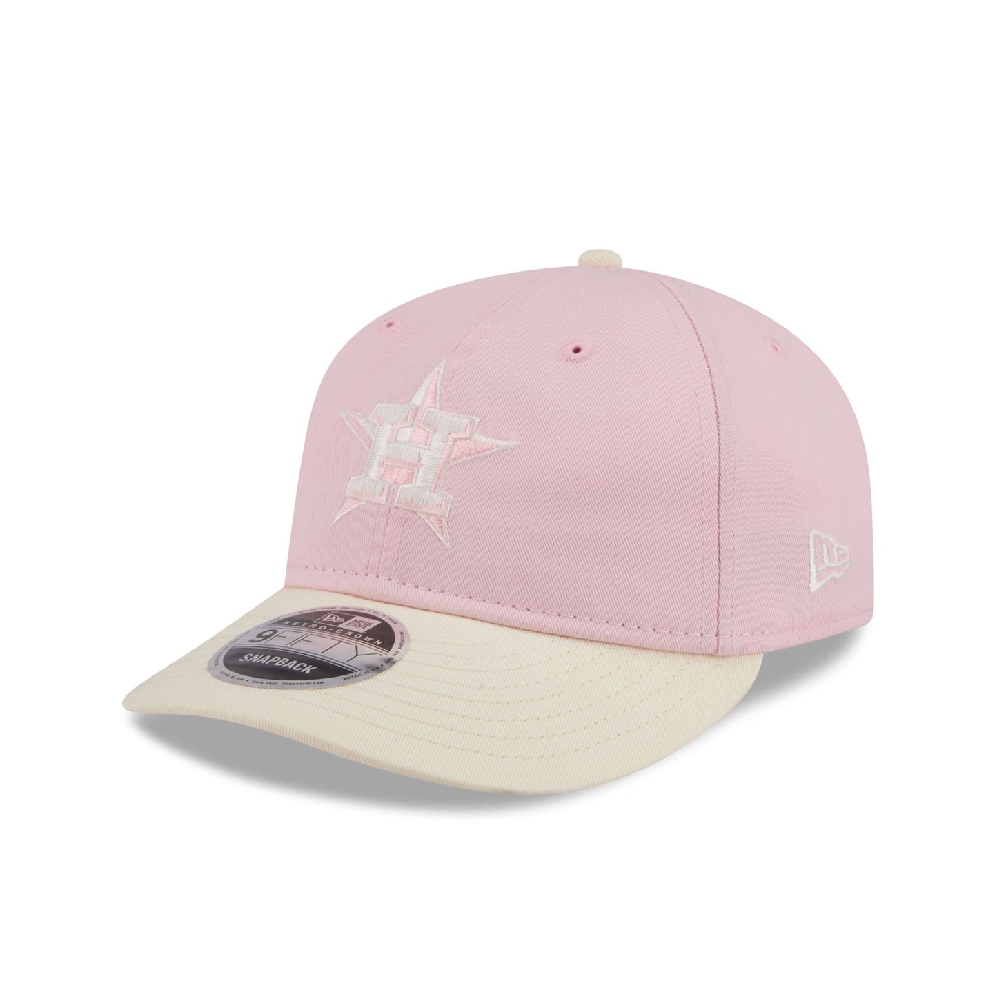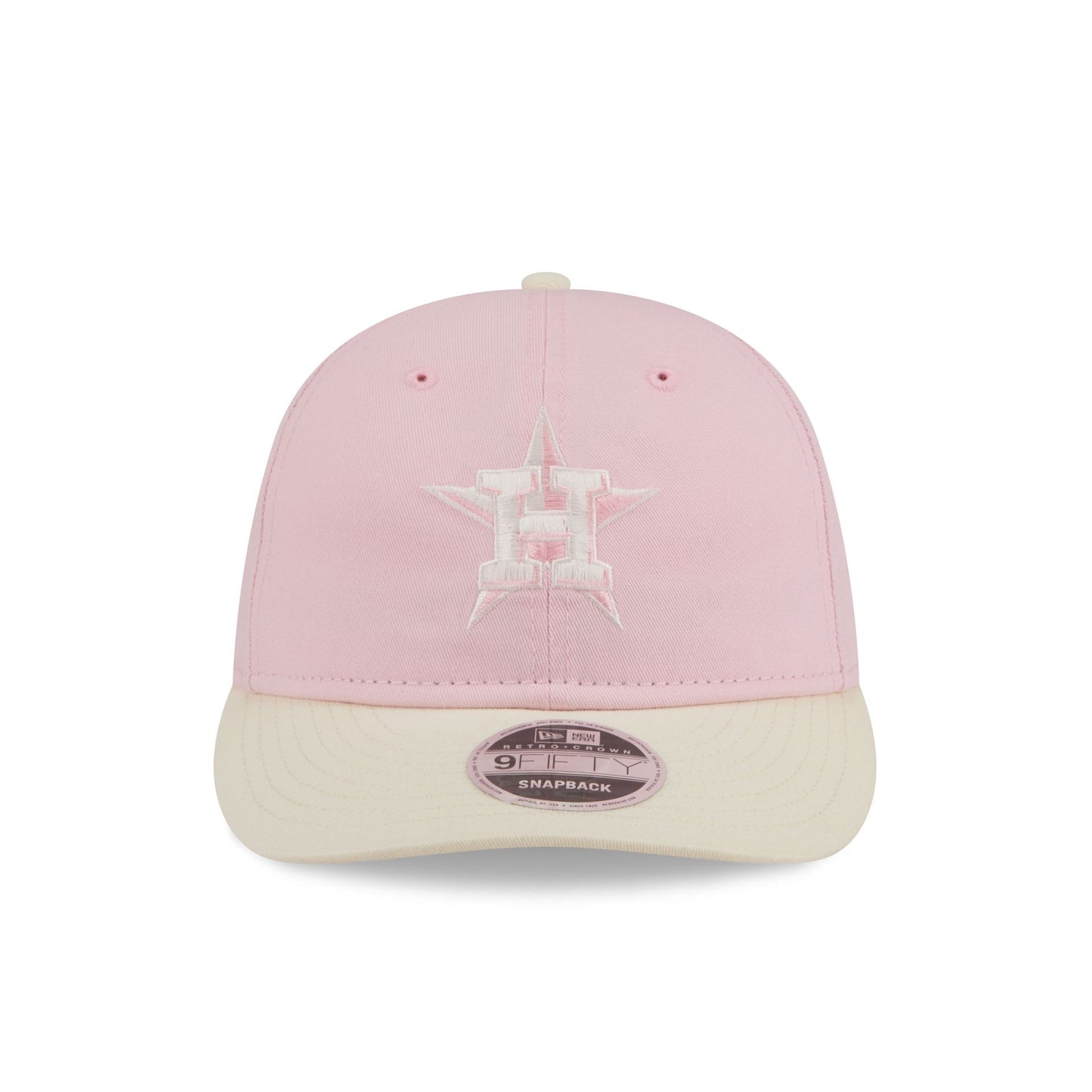 The Houston Astros Light Pink 9FIFTY Snapback features an embroidered Astros logo at the front panels with a 2017 World Series patch at the right-wear side. Additional details include an adjustable heart-shaped snapback closure at the rear and a pink undervisor.