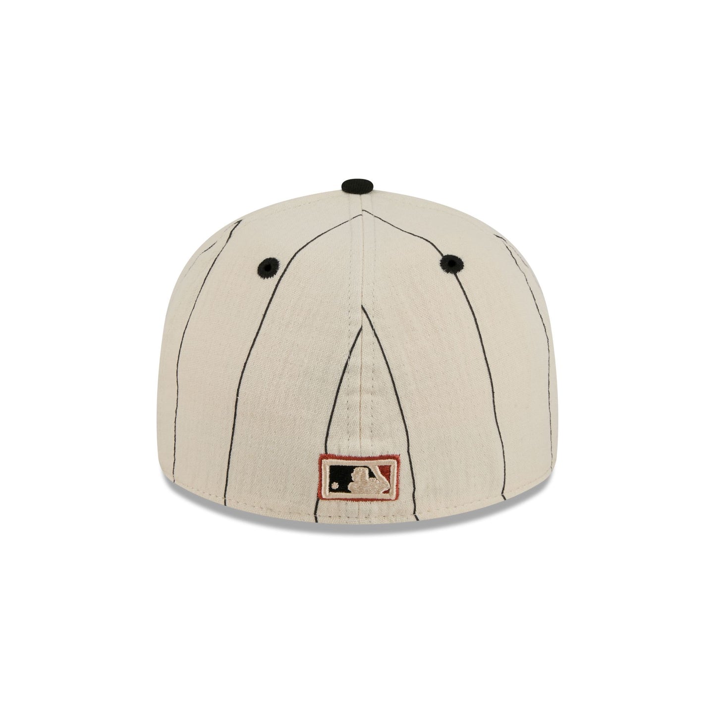 The Houston Astros Linen Pinstripe Retro Crown 59FIFTY Fitted Cap features an embroidered Astros Cooperstown logo at the front panels against a linen pinstripe fabrication throughout. Additional details include the MLB Batterman logo at the rear and a green undervisor.