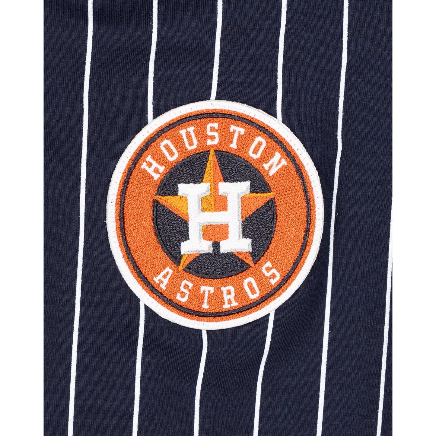 The Houston Astros Logo Select Pinstripe Hoodie features a chenille applique Astros logo at the left chest with team patches at each sleeve and an embroidered team wordmark at the rear.