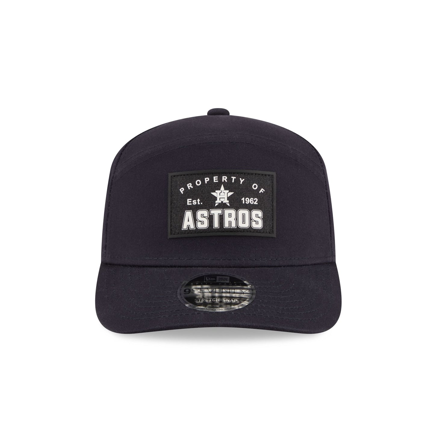 The Houston Astros Property of Patch Split Panel 9SEVENTY Stretch-Snap features a woven "Property of" Astros patch a the front panels with a split crown construction. Additional details include an adjustable stretch-snap closure at the rear and a gray undervisor.