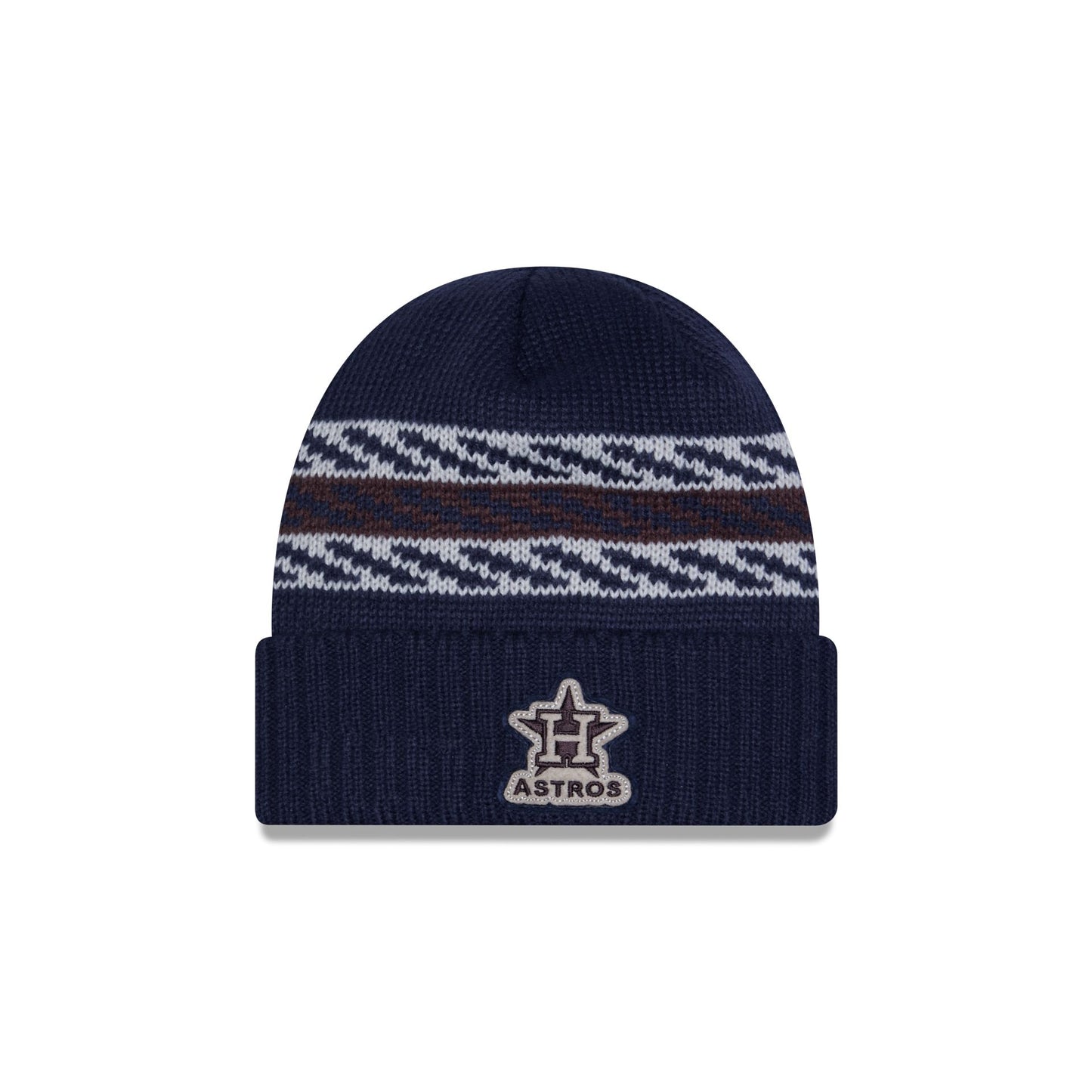 The Houston Astros Quilted Cuff Knit features a double layered felt applique Astros patch at the front with stripe details at the crown and a New Era Flag at the left-wear side.