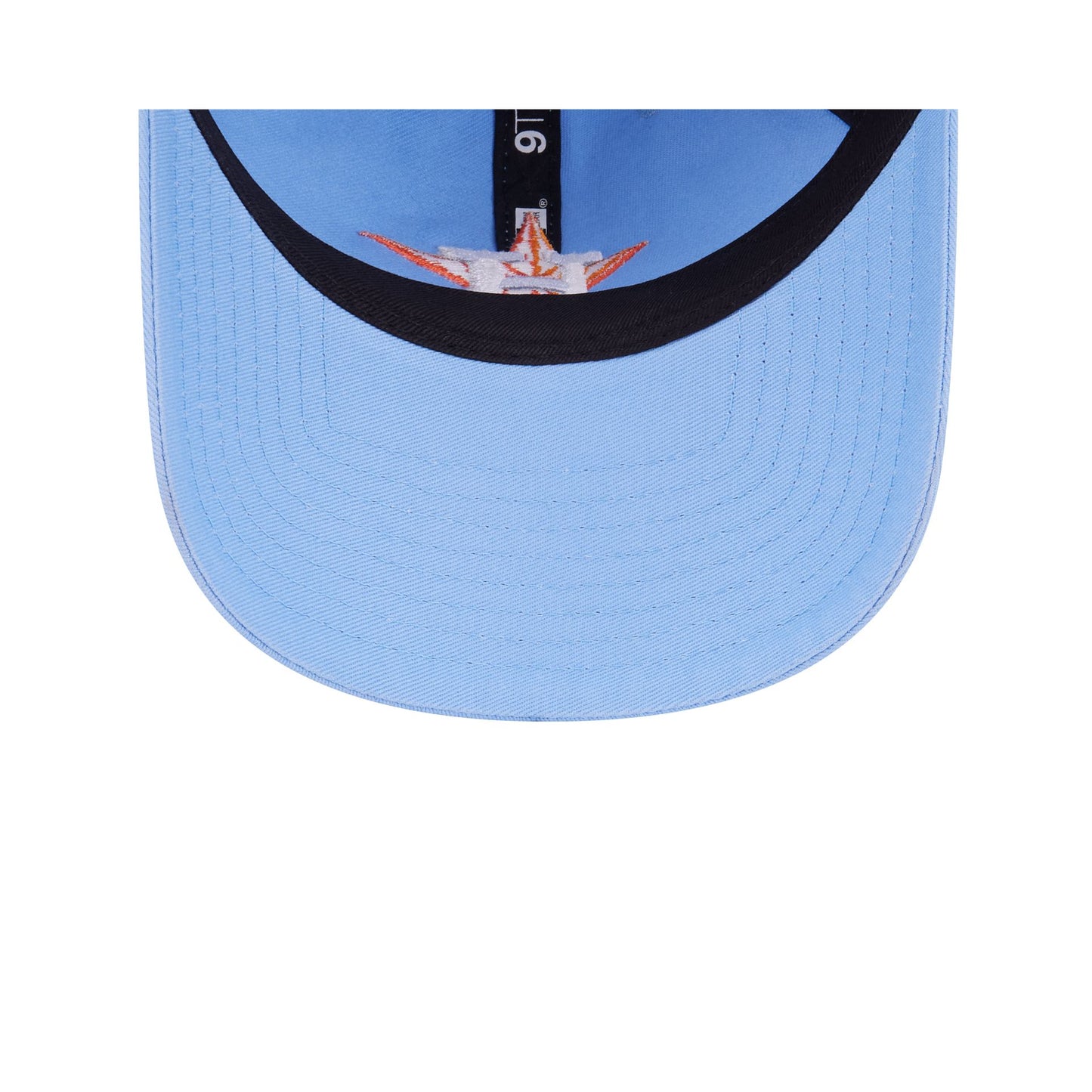The Houston Astros Sky Blue 9TWENTY Adjustable Cap features an embroidered Astros logo at the front panels with a matching woven team logo tag at the adjustable D-Ring closure at the rear.