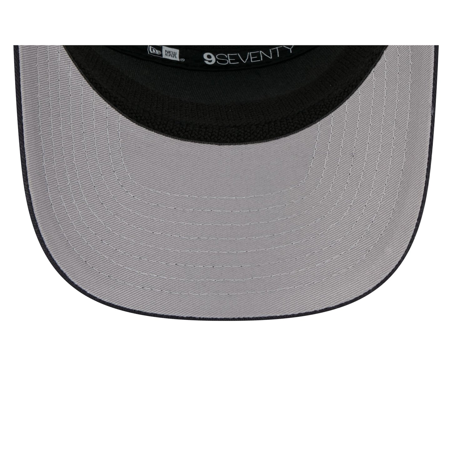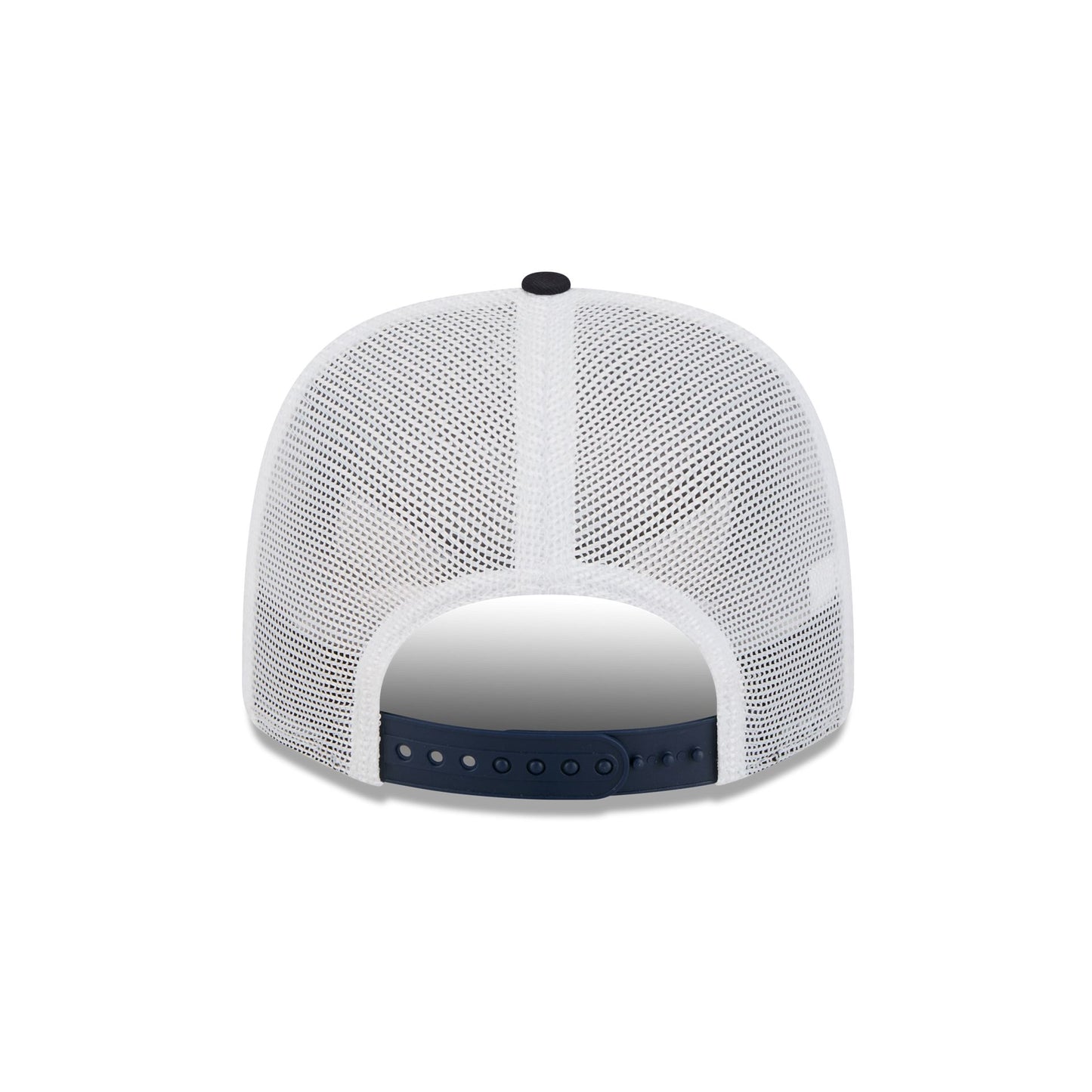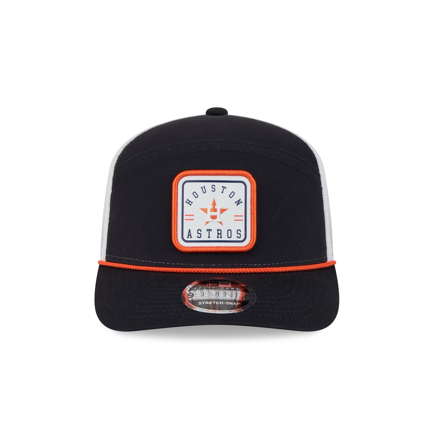 The Houston Astros Square Patch Split Panel 9SEVENTY Trucker features an embroidered Astros square patch at the front panel with a split crown construction and a rope at the visor. Additional details include an adjustable stretch-snap closure at a mesh rear and a gray undervisor.