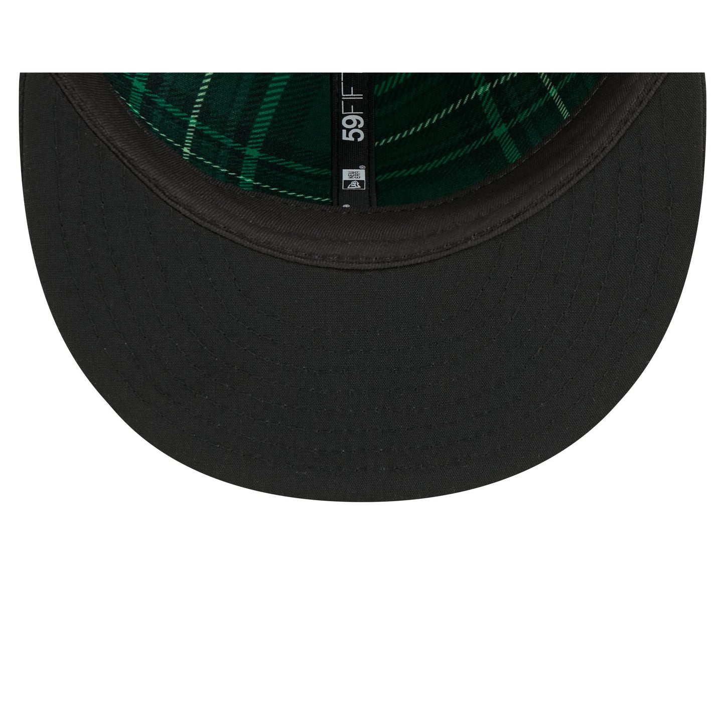 The Houston Astros St. Patrick's Day 2026 59FIFTY Fitted Cap features a green and gold embroidered Astros logo at the front panels with a matching MLB Batterman logo at the rear and a mini shamrock at the top right. Additional details include a team wordmark over a metallic green shamrock baseball diamond patch at the right-wear side with a green plaid interior fabrication at the front panels.