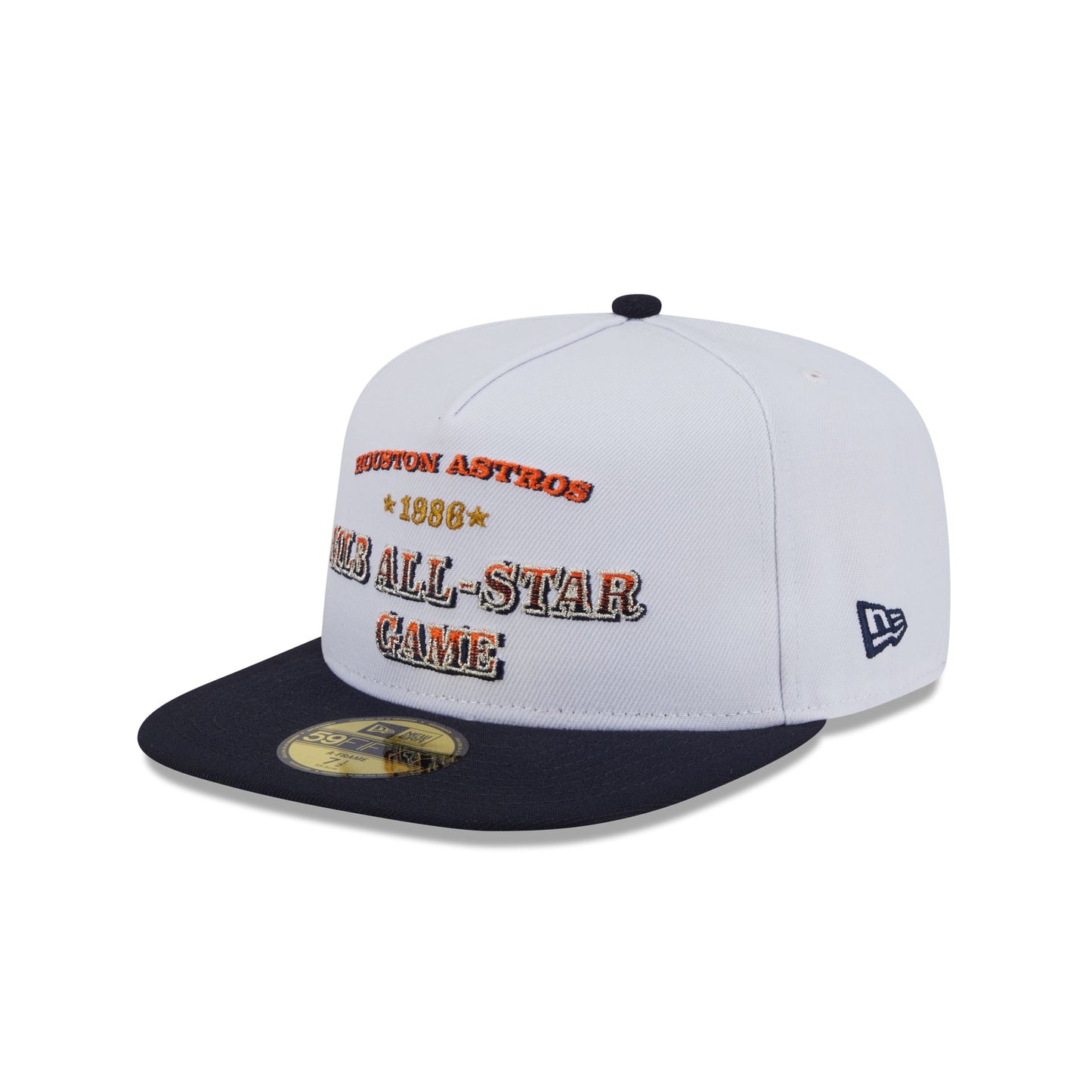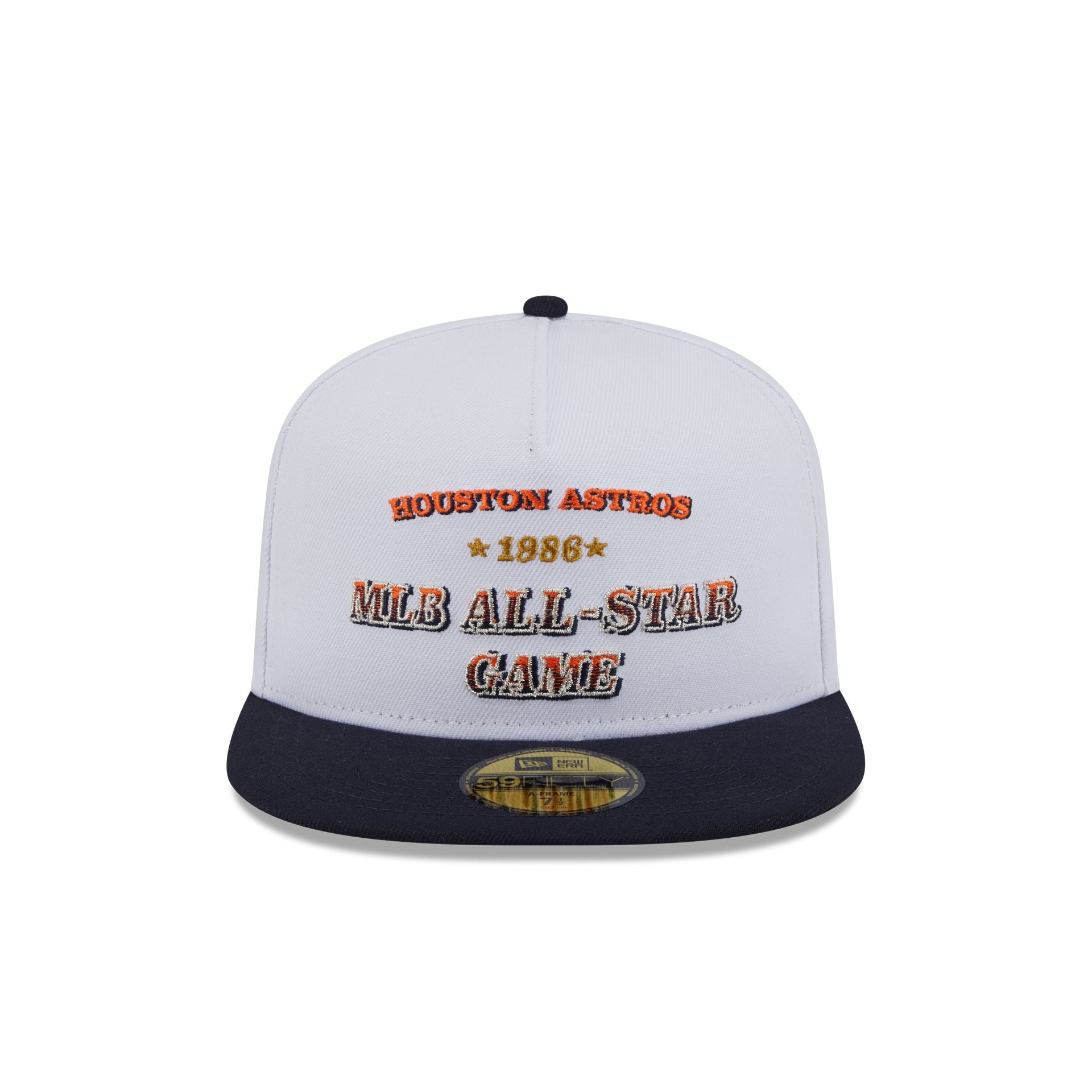 The Houston Astros Summer Derby White 59FIFTY A-Frame Fitted Cap features an embroidered Astros Cooperstown wordmark and a 1986 All-Star Game wordmark at the front panel with a matching All-Star Game patch at the right-wear side. Additional details include a team color MLB Batterman logo at the rear, a navy visor, and a green undervisor.