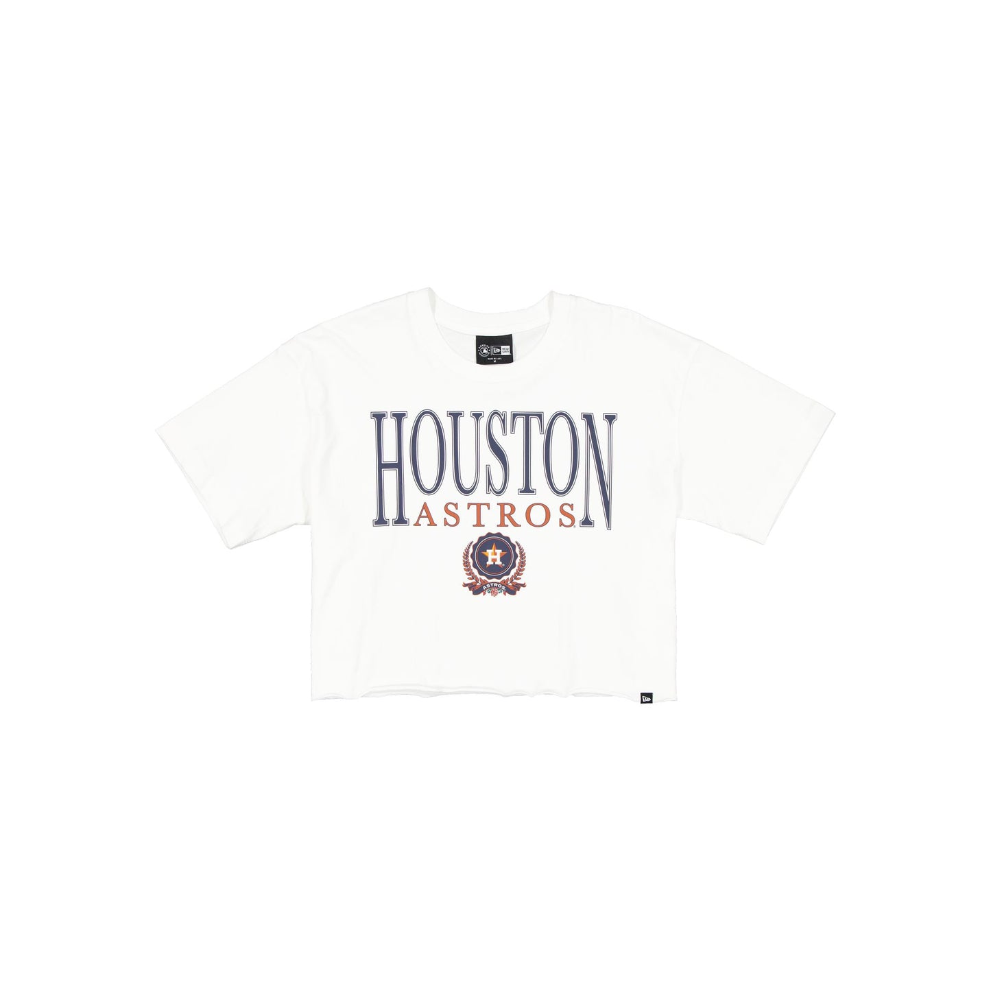 The Houston Astros Throwback Prep Women's Cropped T-Shirt features a screen-printed Astros wordmark above a team emblem at the front.