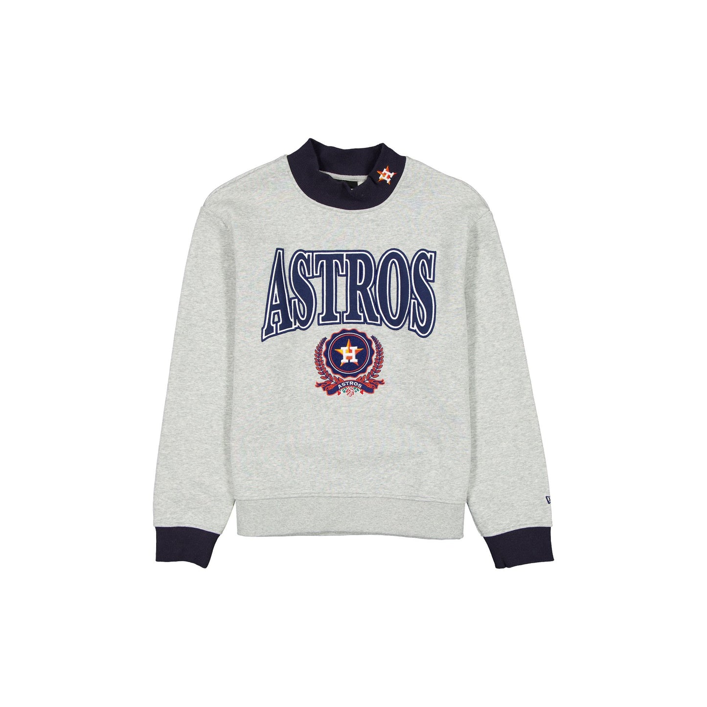The Houston Astros Throwback Prep Women's Mockneck Sweatshirt features an embroidered Astros wordmark above a team emblem at the front with a matching logo at the neckline.