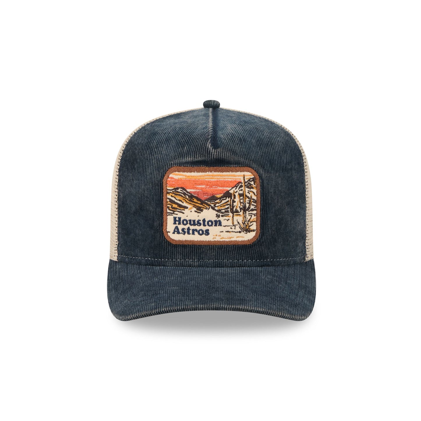 The Houston Astros Vintage Landscape 9FIFTY A-Frame Trucker features an embroidered Astros Vintage Landscape patch at the front panels with a team logo at the right-wear side. Additional details include an adjustable snapback closure at the rear and a gray undervisor.