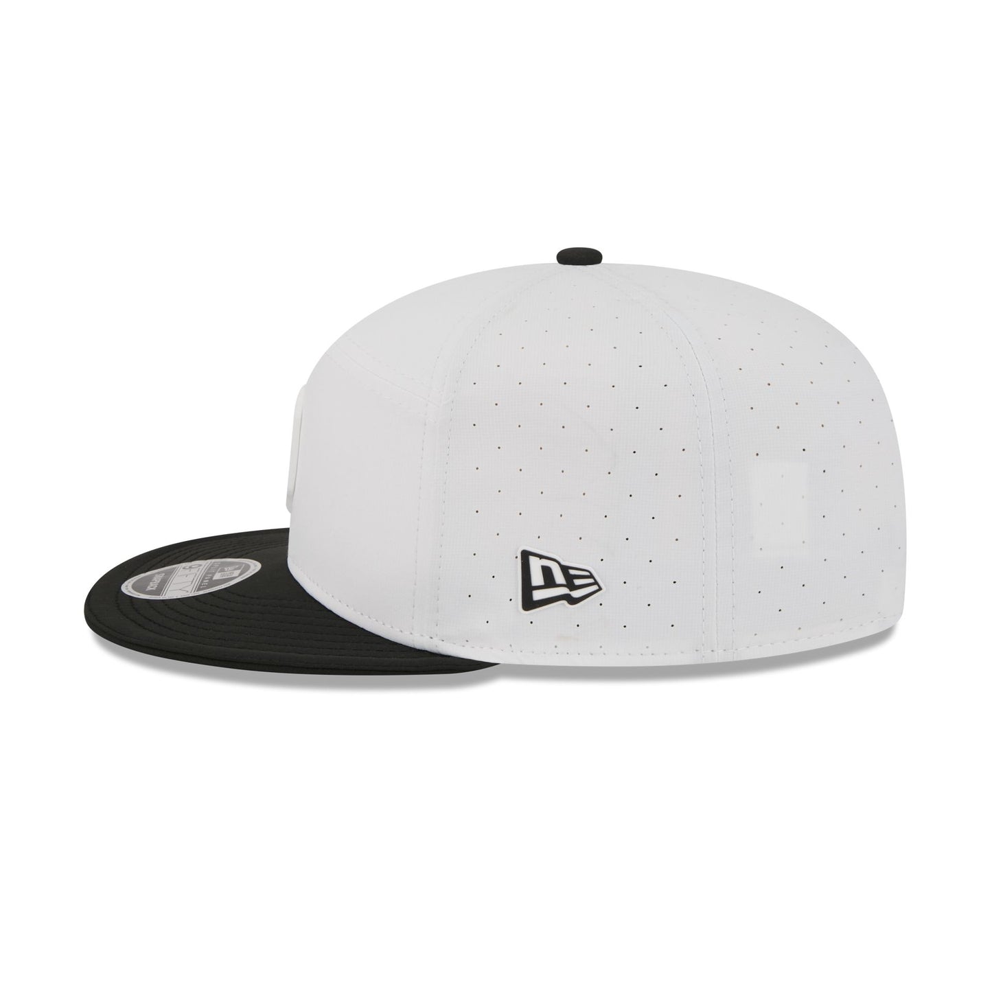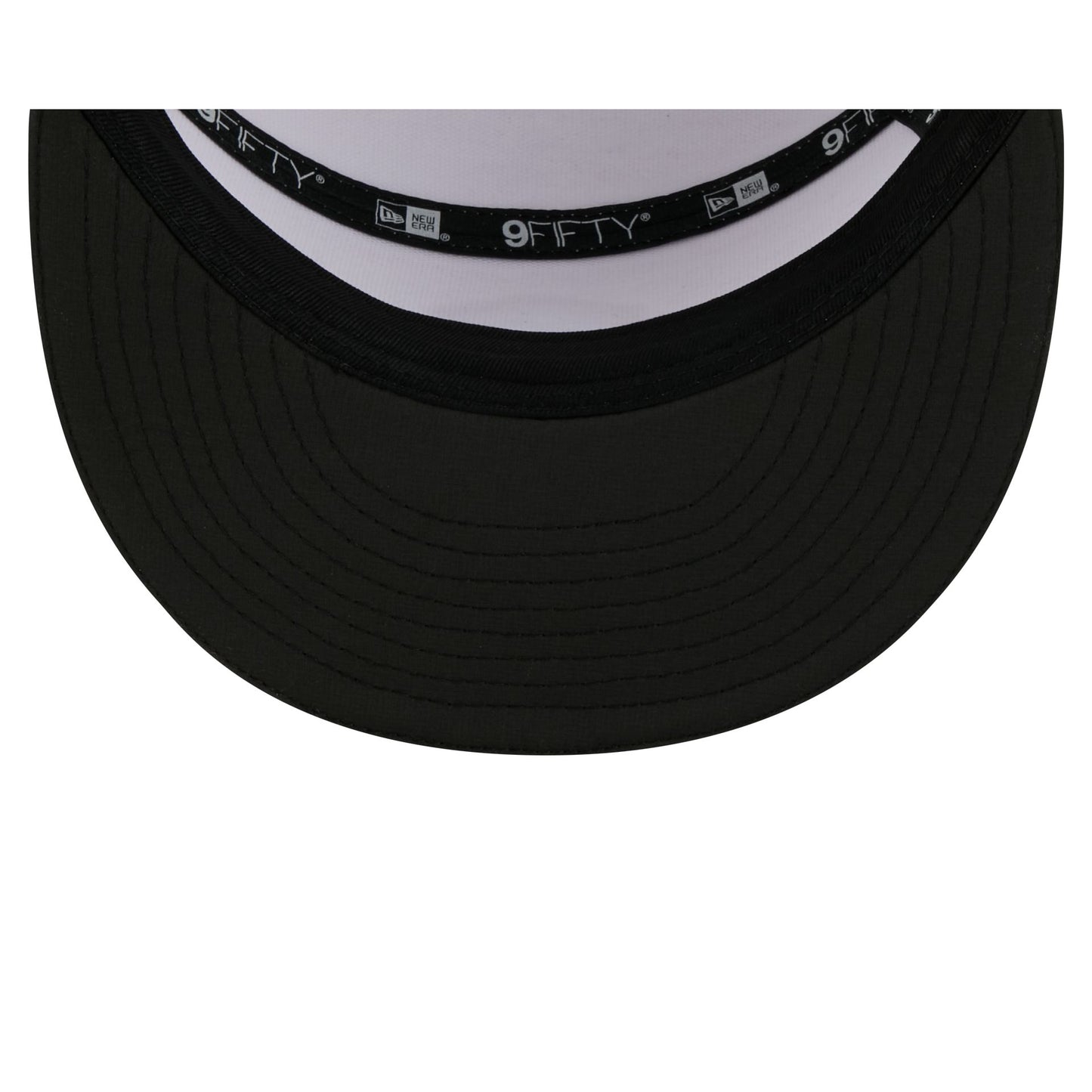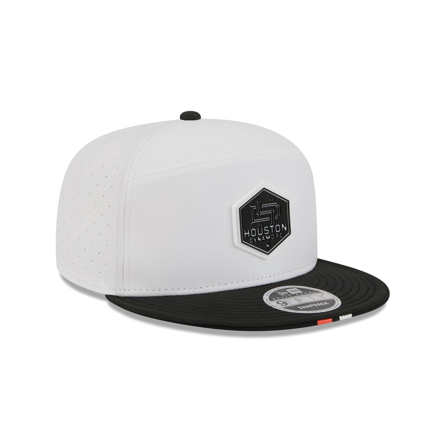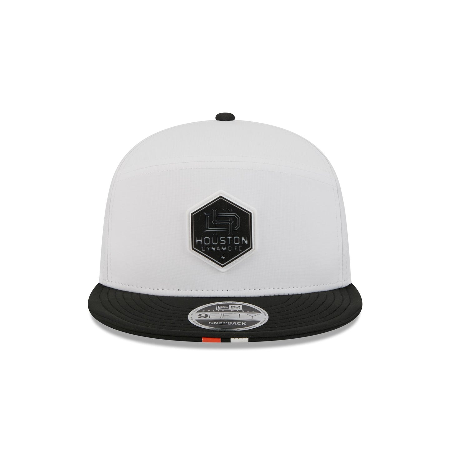 The Houston Dynamo 2026 MLS Kickoff Split Panel 9FIFTY Snapback features a stitch-down silicone Dynamo logo patch at the front panel with a matching woven MLS Shield tag above a snapback closure at the rear. Additional details include a quill tech performance fabrication with a black visor accented with team color stripes at the front.