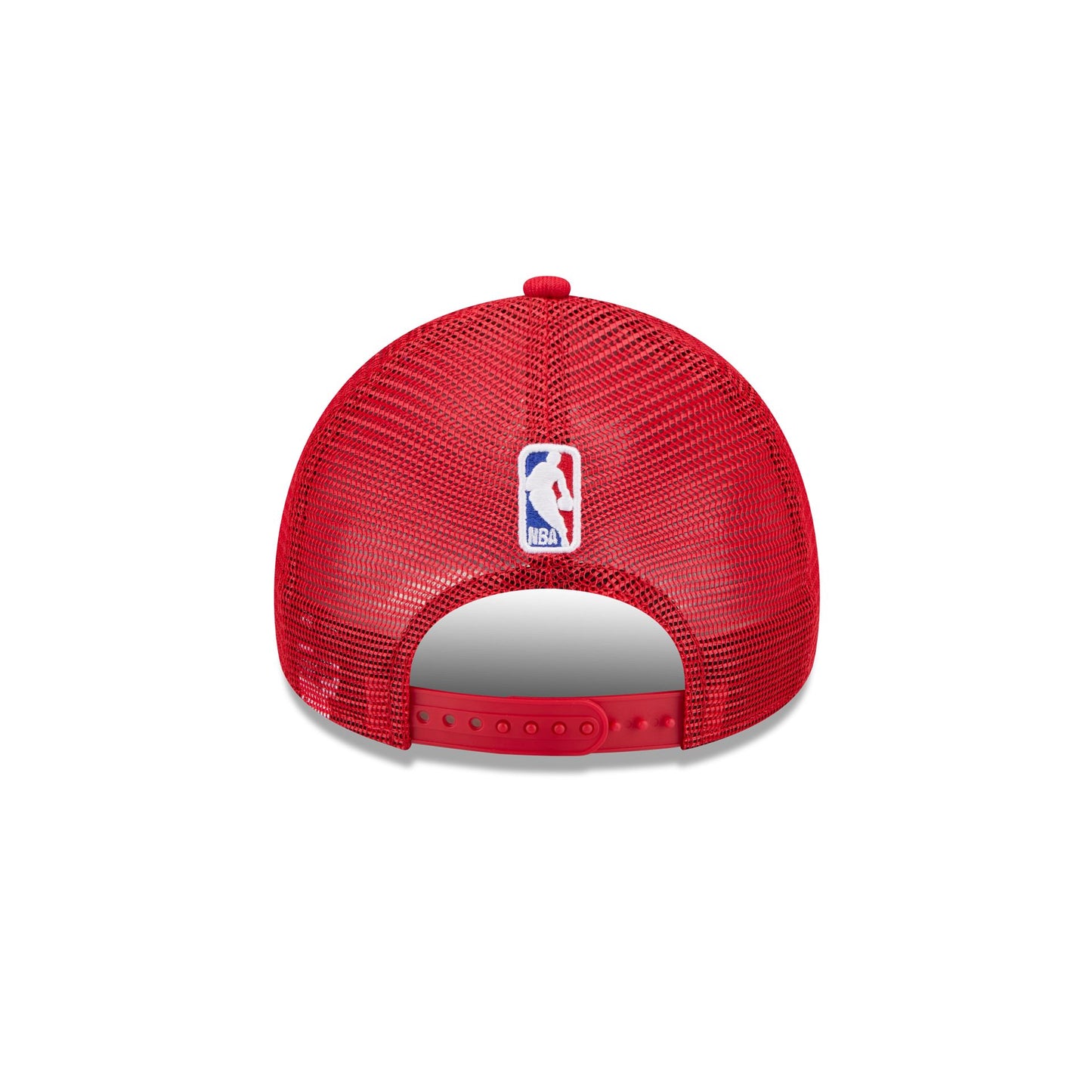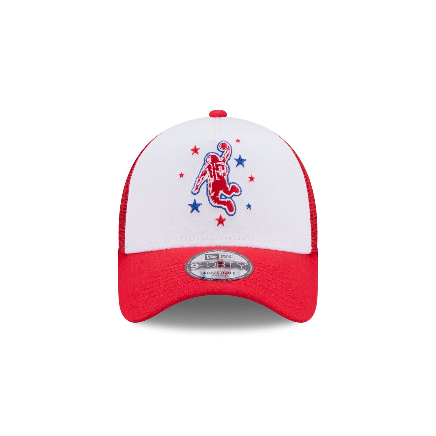 The Houston Rockets 2025 City Edition 9FORTY A-Frame Trucker features an embroidered Rockets City Edition logo at the front panels with a logo at the right-wear side. Additional details include the NBA Logoman above an adjustable snapback closure at a mesh rear and a gray undervisor.