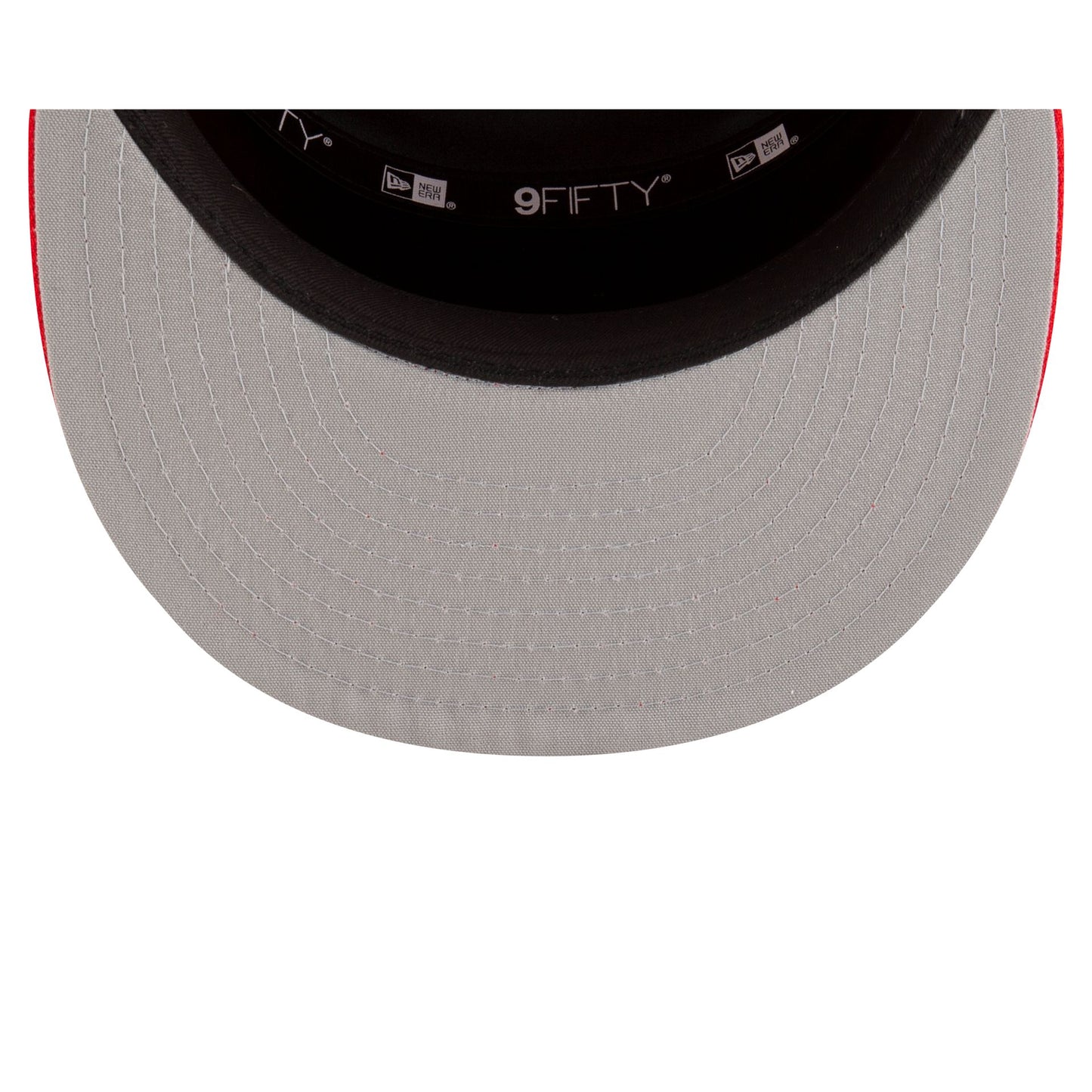 The Houston Rockets 2025 Tip-Off Split Panel 9FIFTY Snapback features an embroidered Rockets logo at the front panels against a pinstripe jersey fabrication with the NBA Logoman at the right-wear side. Additional details include an adjustable snapback closure at the rear and a gray undervisor.