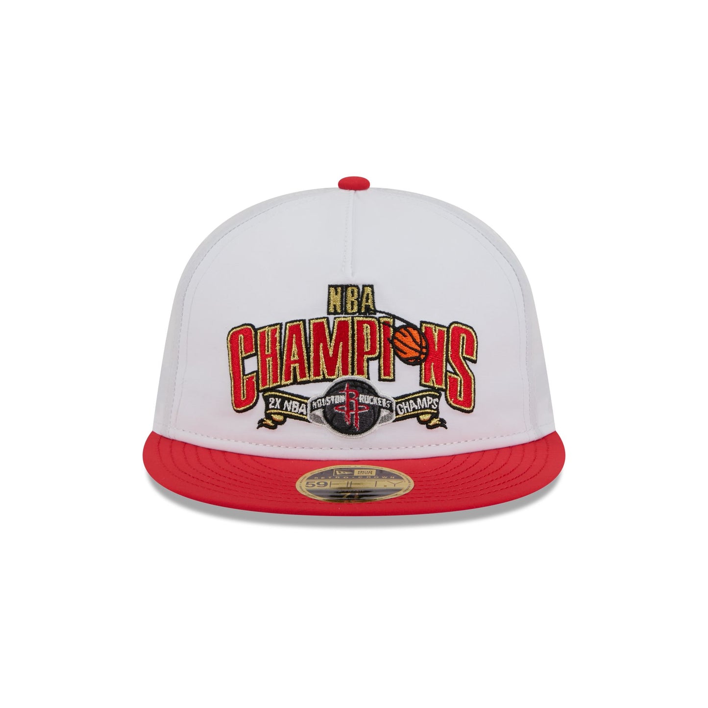 The Houston Rockets Champions White Retro Crown 59FIFTY Fitted Cap features an embroidered Rockets Champions graphic at the front panels with the NBA Logoman at the rear and a gray undervisor.