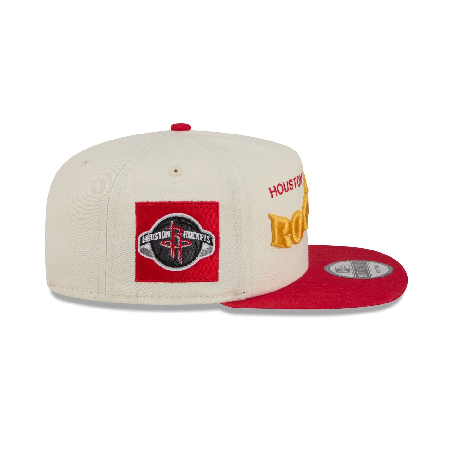 The Houston Rockets Conference Script Chrome White 19TWENTY Adjustable Cap features an embroidered Rockets graphic at the front panels with a team patch at the right-wear side. Additional details include an adjustable snapback closure at the rear and a green undervisor.