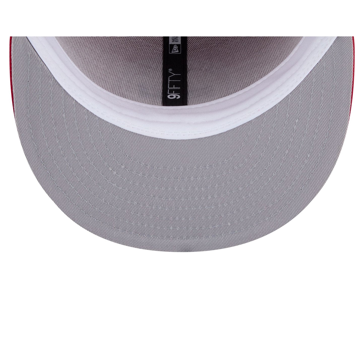 The Houston Rockets 1972-1994 Hardwood Classics 9FIFTY Snapback features an embroidered vintage Rockets logo at the front panels with the NBA Logoman at the right-wear side. Additional details include an adjustable snapback closure at the rear and a gray undervisor.