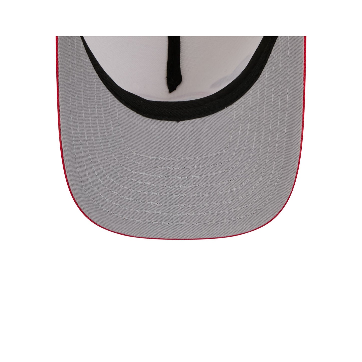 The Houston Rockets 1972-1994 Hardwood Classics Chrome White 9FIFTY A-Frame Snapback features an embroidered vintage Rockets logo at the front panels with a team graphic to the right. Additional details include an adjustable snapback closure at the rear and a gray undervisor.
