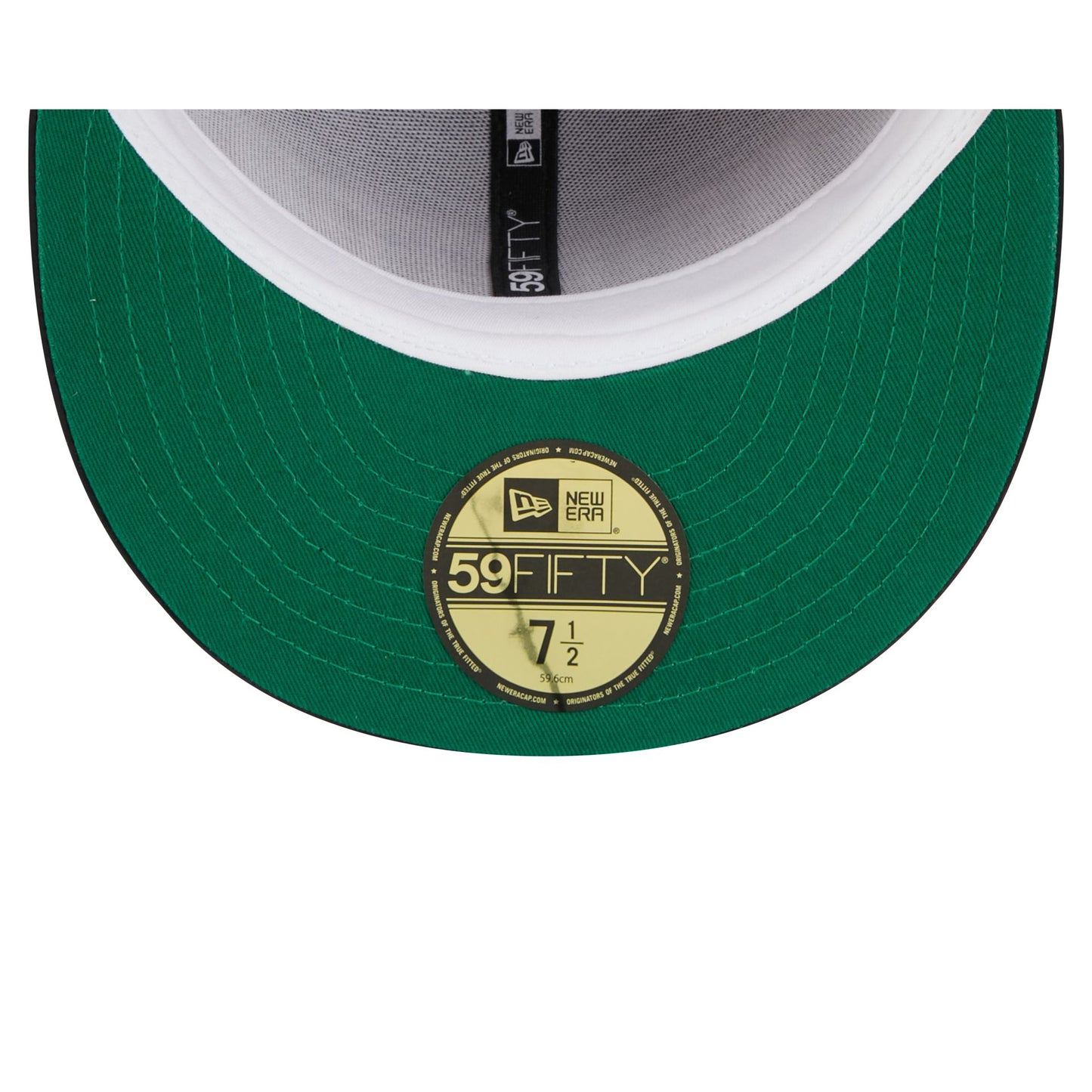 The Houston Rockets Spring Satin 59FIFTY Fitted Cap features an embroidered Rockets wordmark at the front panels with a New Era pin at the top left panel and an NBA Logoman at the rear. Additional details include a satin fabrication throughout, a logo at the right-wear side, and a green undervisor.