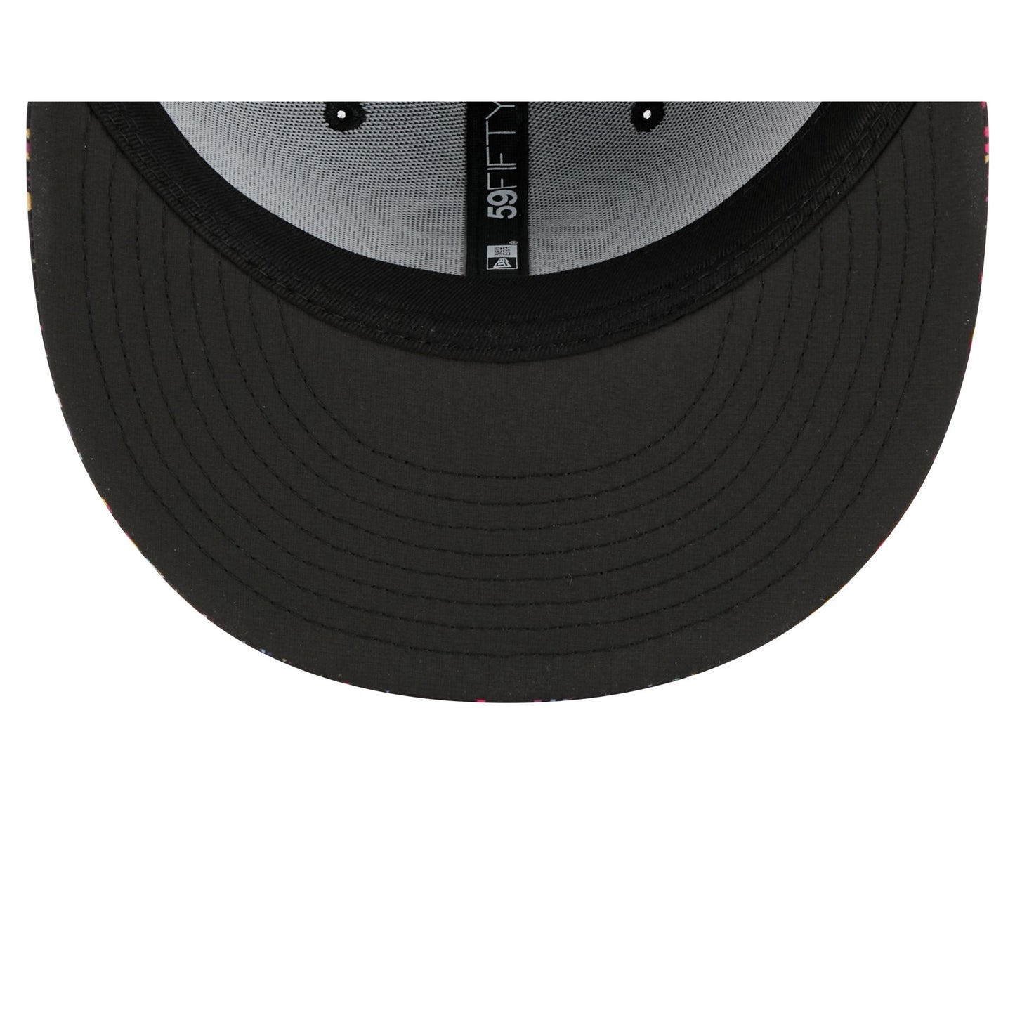 The Houston Texans 2025 Crucial Catch 59FIFTY Fitted Cap features an embroidered Texans logo at the front paint splatter panels with an NFL Shield at the rear, a Crucial Catch Intercept Cancer patch at the right-wear side, and a black undervisor.