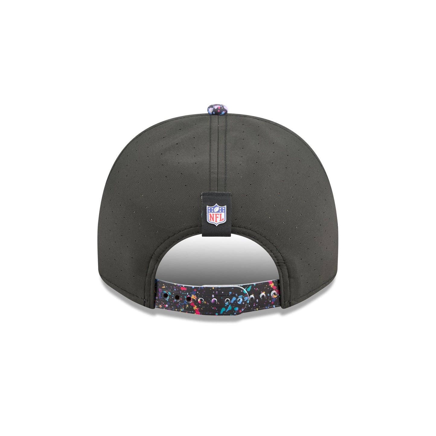 The Houston Texans 2025 Crucial Catch 9FIFTY A-Frame Snapback features an embroidered Texans logo at the front paint splatter panels with a woven NFL Shield tag above a snapback closure at the rear. Additional details include a Crucial Catch Intercept Cancer patch at the right-wear side and a black undervisor.