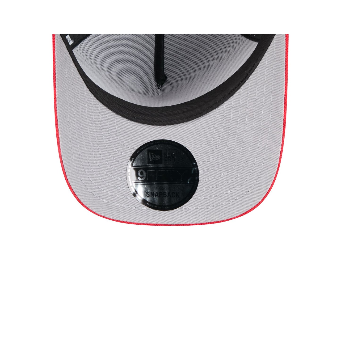 The Houston Texans 2025 Draft 9FIFTY A-Frame Snapback features an embroidered Texans logo and wordmark at the front panels with an NFL Shield logo above a snapback closure at the rear. Additional details include ornamental stitched details at the visor and a gray undervisor.