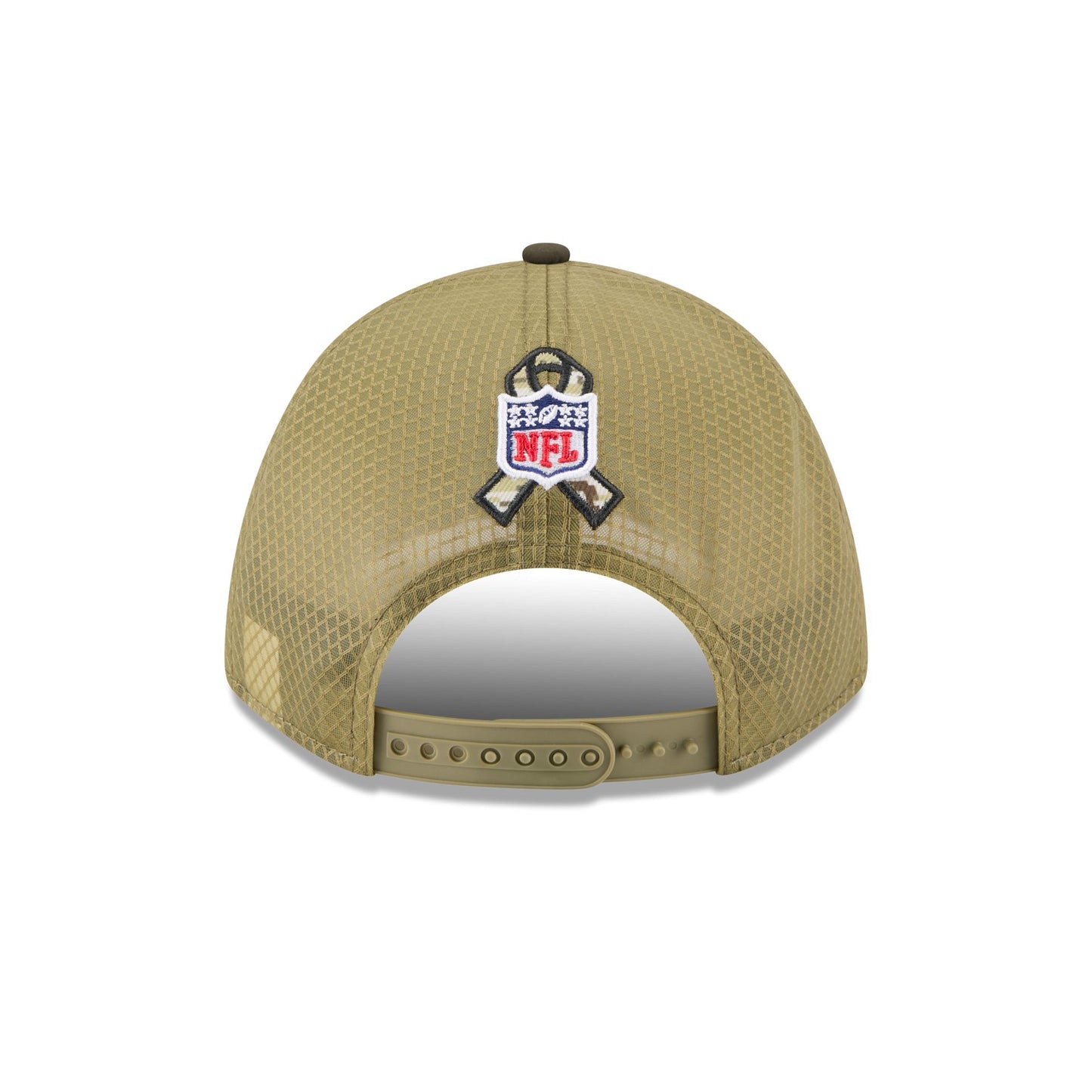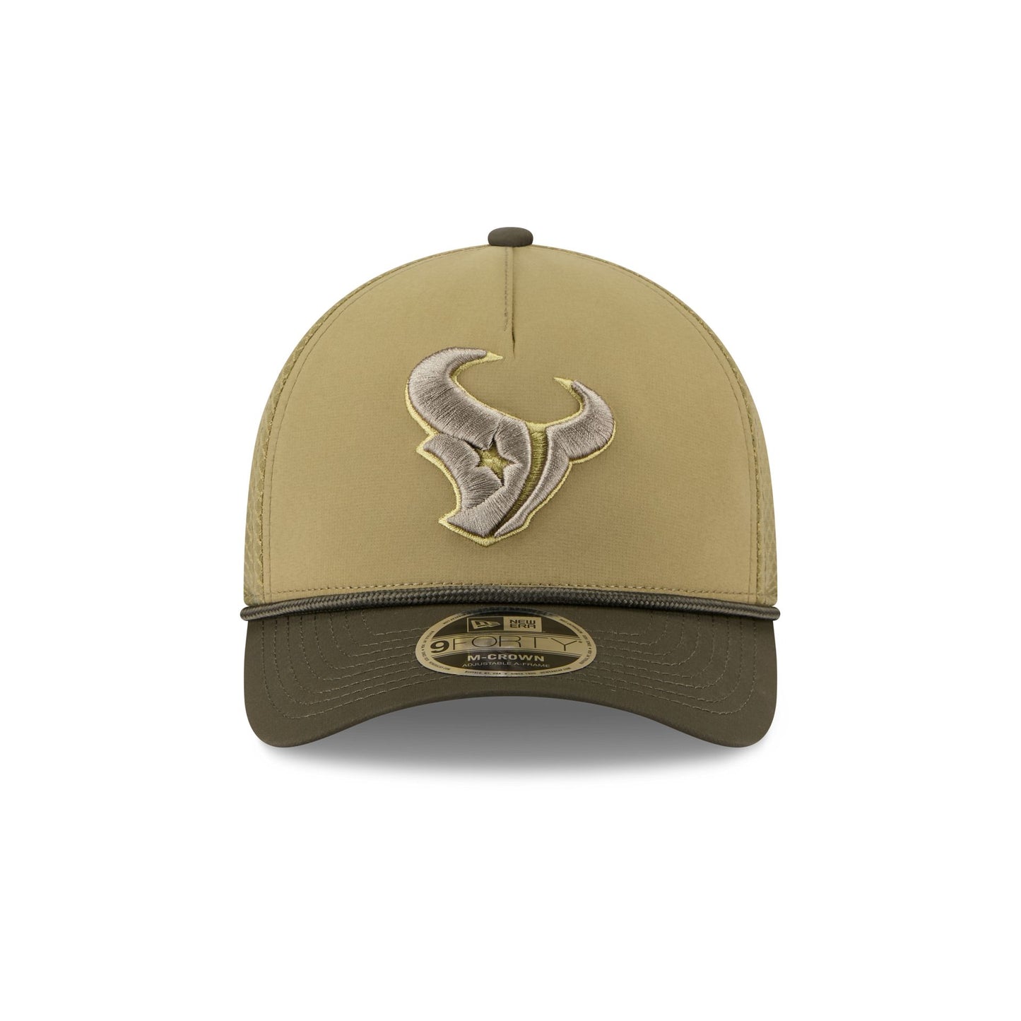 The Houston Texans 2025 Salute to Service 9FORTY M-Crown A-Frame Trucker features an embroidered Texans logo at the front panel with the official NFL Salute to Service patch above a snapback closure at the rear. Additional details include an American flag patch at the right-wear side with a silicone team logo patch at a dark green undervisor and a digi camo interior fabrication.
