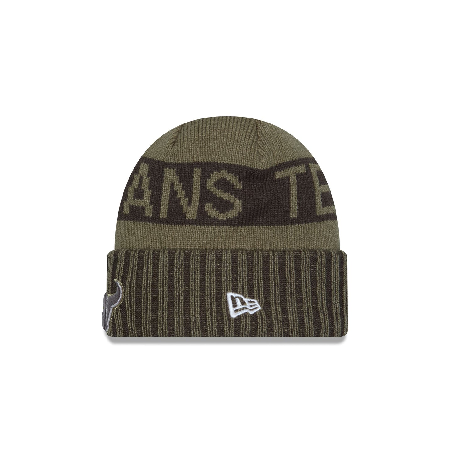 The Houston Texans 2025 Salute to Service Cuff Knit features an embroidered Texans logo at the front with a team wordmark at the crown, an American flag patch at the right-wear side, and the official NFL Salute to Service patch at the rear.