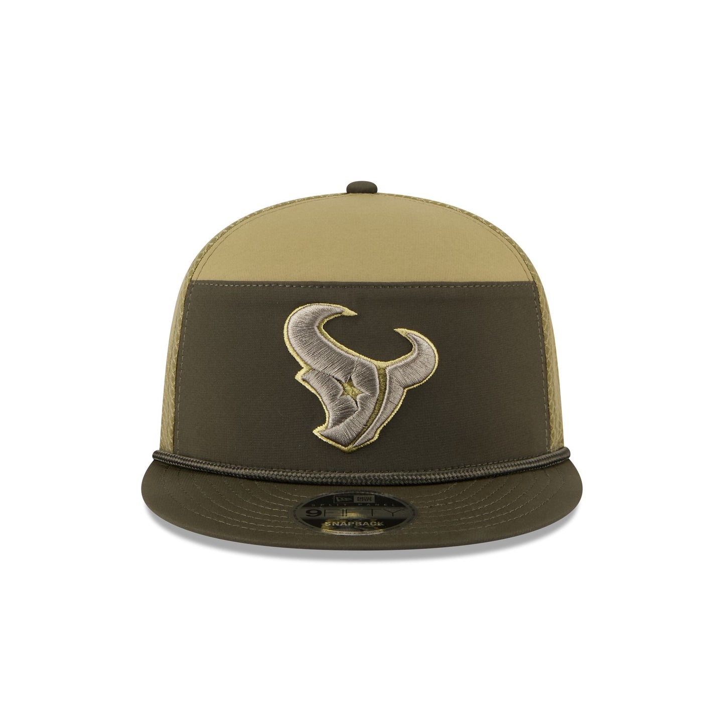 The Houston Texans 2025 Salute to Service Split Panel 9FIFTY Trucker features an embroidered Texans logo at the front panels with the official NFL Salute to Service patch above a snapback closure at the rear. Additional details include an American flag patch at the right-wear side with a silicone team logo patch at a dark green undervisor and a digi camo interior fabrication.