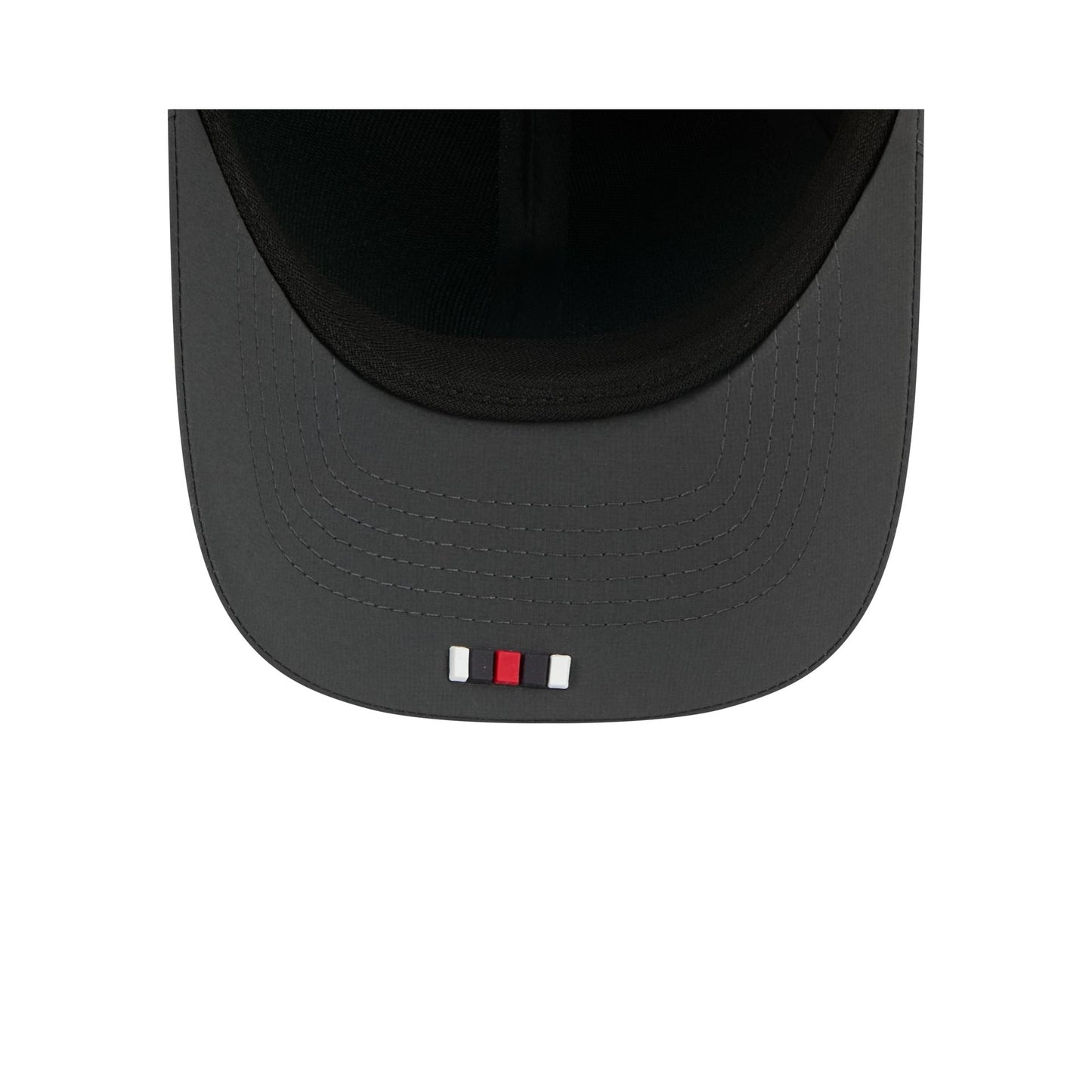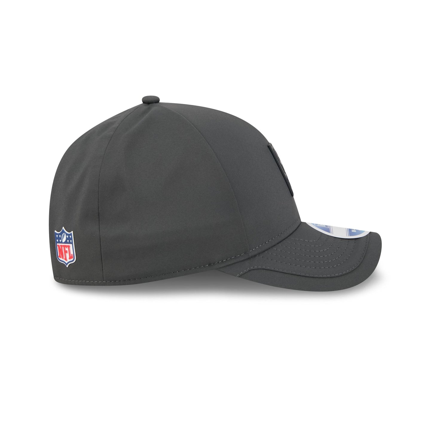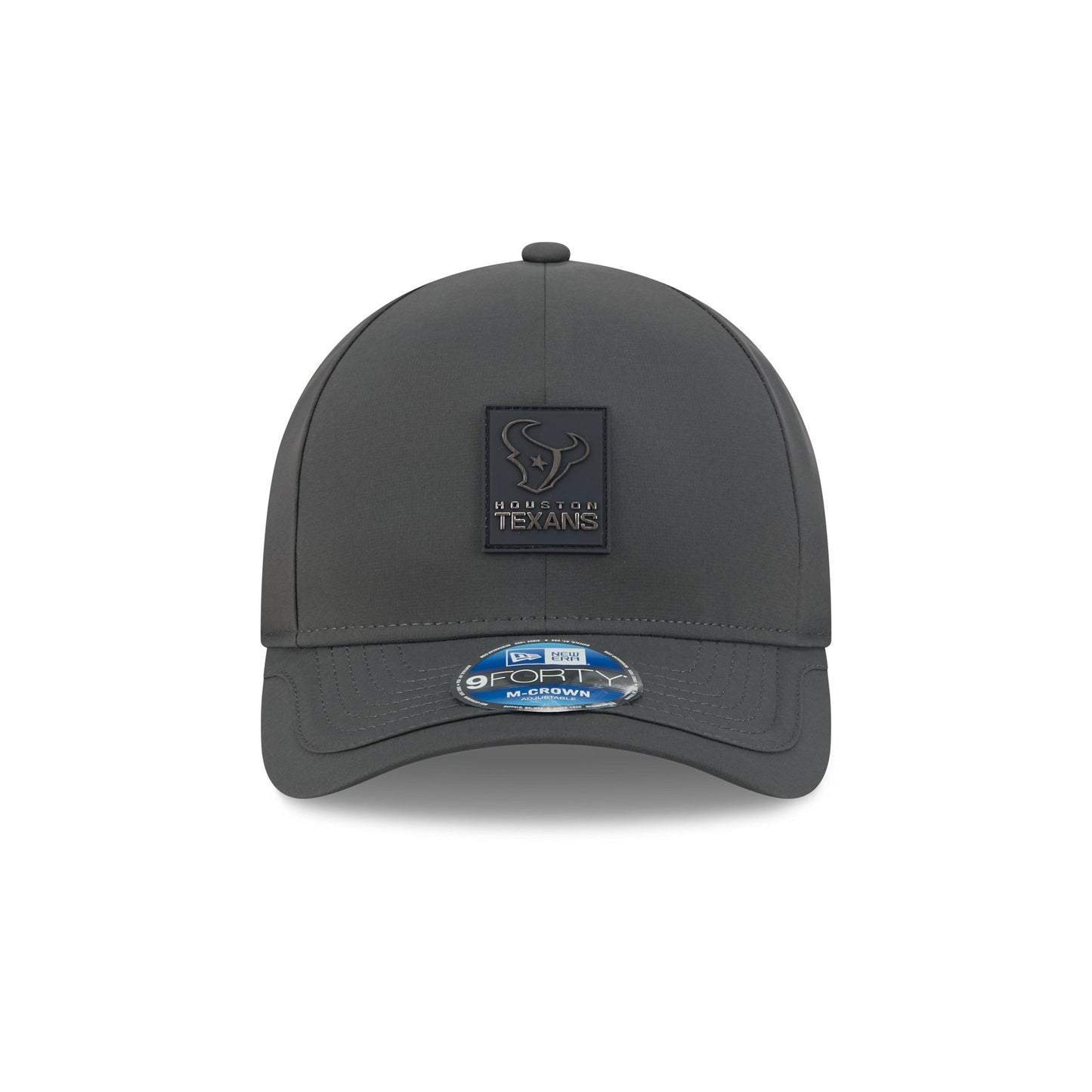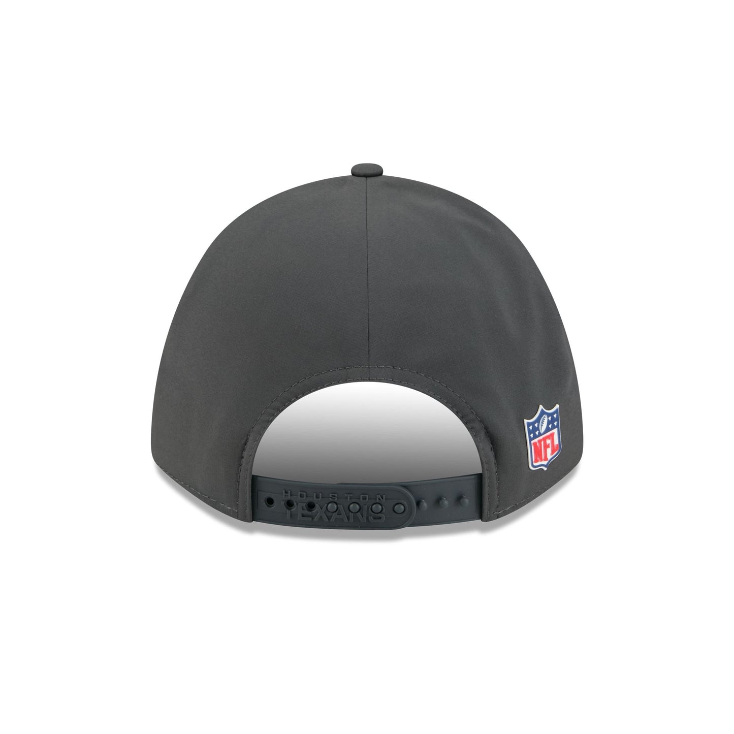 The Houston Texans 2025 Sideline Cold Weather Steel Clouds 9FORTY M-Crown Snapback features a sewn-down silicone Texans logo patch at the front panels with a water-repellent quill tech fabrication throughout and a quick-dry cushioned sweatband to absorb moisture. Additional details include the Official NFL Shield logo to the right of a soft silicone snapback closure at the rear. The crown has bonded seams to trap warmth and the undervisor is accented with a silicone transfer in the team’s colors.