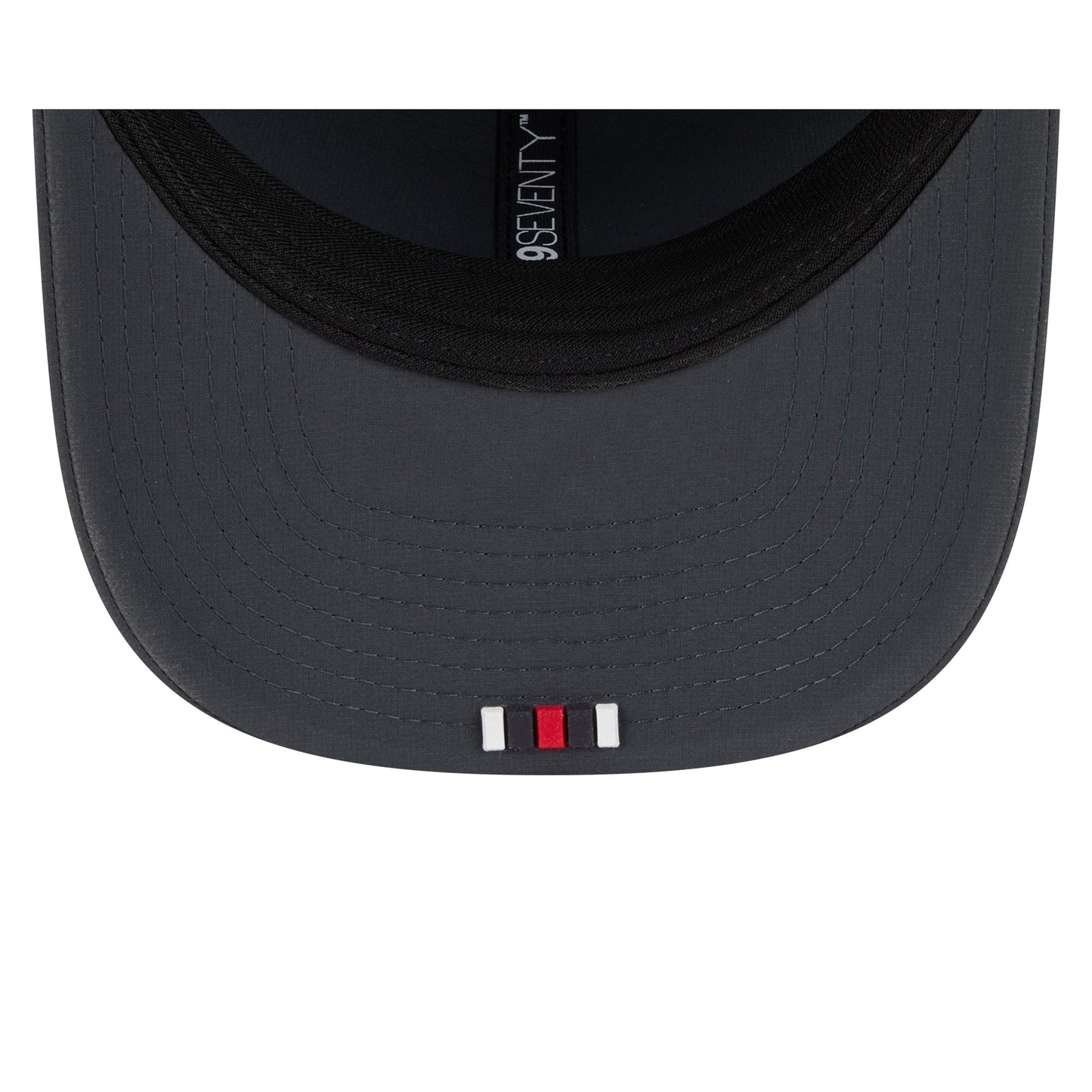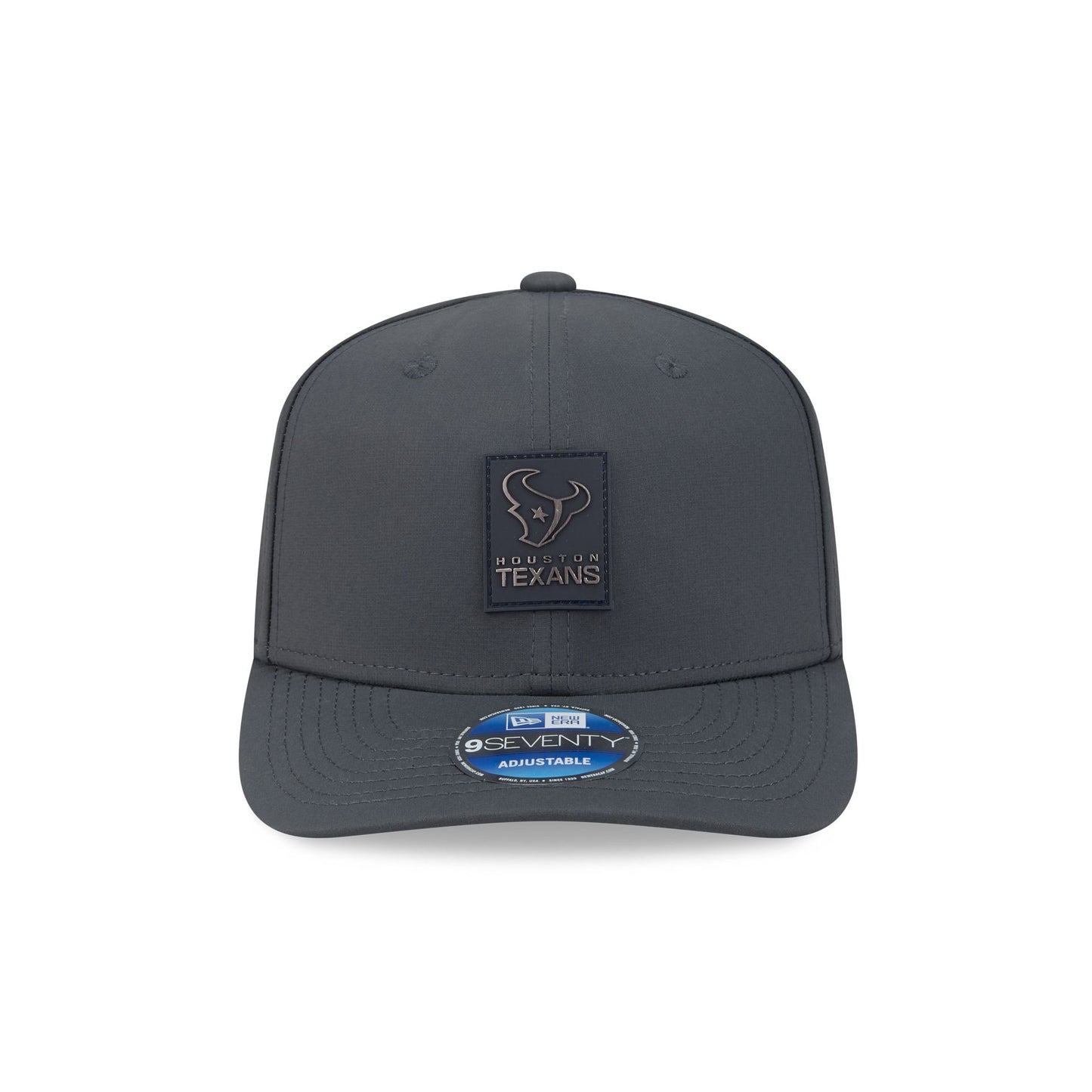 The Houston Texans 2025 Sideline Cold Weather Steel Clouds 9SEVENTY Stretch-Snap features a sewn-down silicone Texans logo patch at the front panels with a water-repellent quill tech fabrication throughout and an insulated crown with a quick-dry cushioned sweatband. Additional details include the Official NFL Shield logo to the right of a soft silicone snapback closure at the rear. The undervisor is accented with a silicone transfer in the team’s colors.